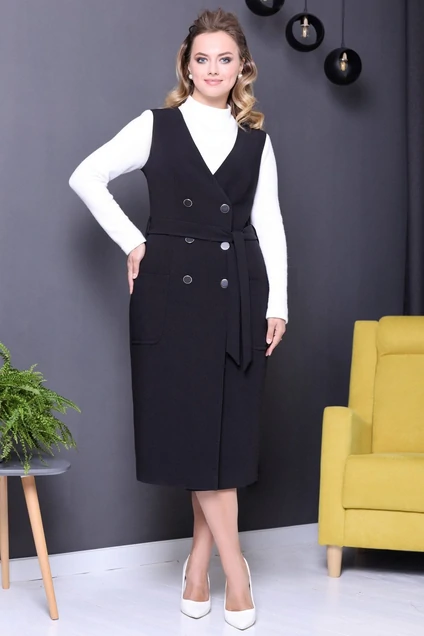 Сарафан прилегающего силуэта, отрезной по линии талии, с застежкой на обтачные декоративные петли. На полочках сарафана накладные карманы с клапаном, входящие в боковой шов. Клапан украшен декоративной петлей. В верхней части сарафана нагрудная вытачка переходит в подрез по талии. Спинка со средним швом. Сарафан на подкладке . Длина сарафана: 113 см.