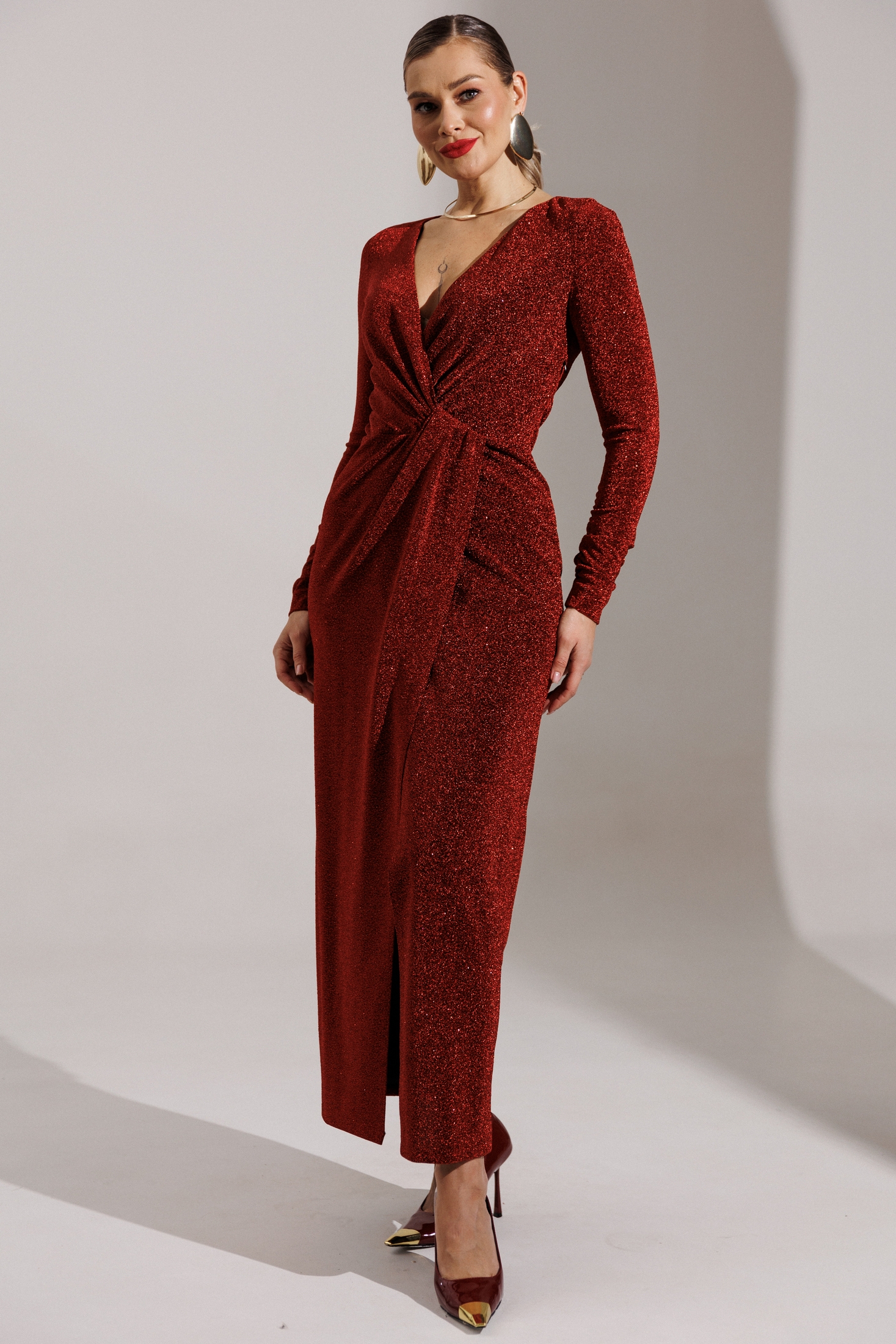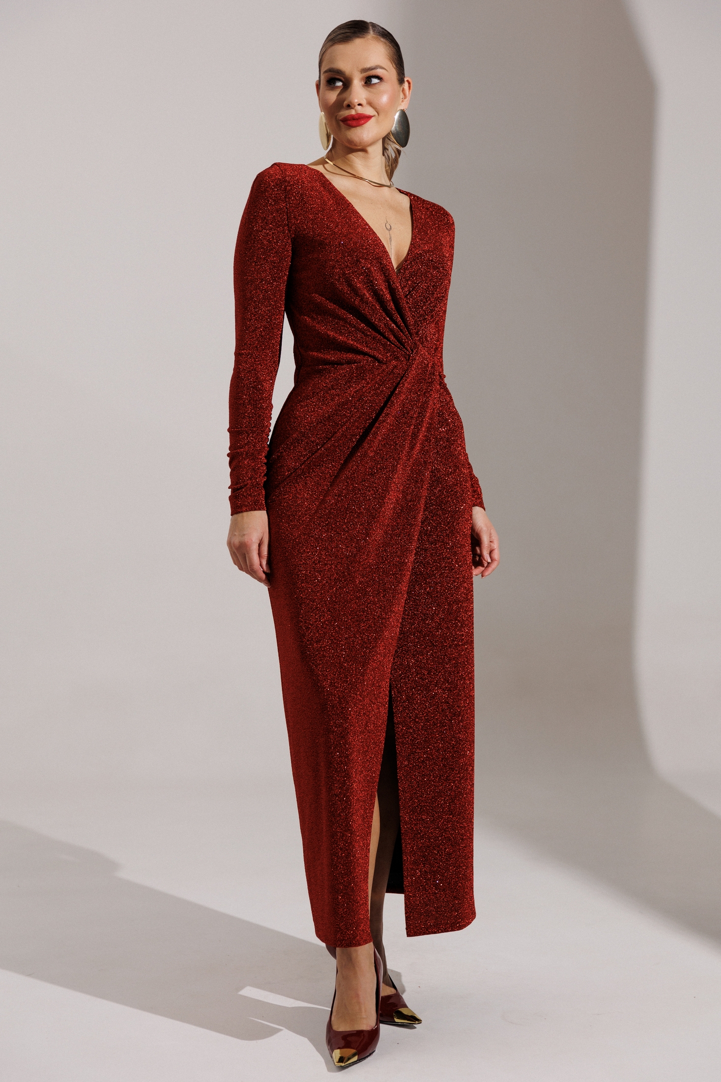 Блеск софитов, огни салютов, игривые пузырьки в бокале - и Ваше сияние обеспечено нашим вечерним платьем! Это действительно озорно, игриво, празднично! И, как ни крути, приковывает взгляды! Представленное платье приталенного силуэта. Спинка с талиевыми вытачками. Перед отрезной по линии талии. Лиф с эффектным V-образным вырезом и узлом в области талии. Юбка на запах. Рукав полуреглан, присборенный на резинку в нижней части (по шву). Платье на подкладке. Материал платья - тонкий трикотаж с блеском. Хорошо тянется