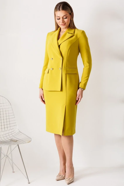 Платье 26-2967 горчица Мода-Юрс — это идеальный выбор для уверенной женщины. Коллекция бренда Мода-Юрс предлагает платье-блейзер полуприлегающего силуэта, выполненное из качественной смеси полиэстера и вискозы с добавлением спандекса для комфорта и легкости в носке. Горчичный цвет добавляет смелости образу. Платье ниже колена с двубортной застёжкой и потайной молнией сбоку придаёт деловой стиль. Длинные, двушовные рукава завершают образ. Внутренние карманы с клапанами и воротник пиджачного типа делают его универсальным решением для делового и делового повседневного гардероба в весенне-осенний сезон. Длина спинки составляет 112 см, а длина рукава — 61 см, что подчеркивает статус и деловой настрой.