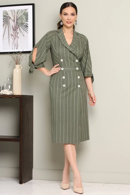 Эффектное платье из льна в полоску. Платье приталенного силуэта с имитацией двубортной застежки на пуговицы. Отрезное по линии талии, с притачным поясом. Спинка в в верхней части со средним швом и рельефами. По переду также рельефы. Воротник отрезной, пиджачного типа. Платье прямое к низу. Молния сбоку. Фантазийные объемные рукава покроя "реглан", по низу на манжете с завязками. длина по спинке: 113 см