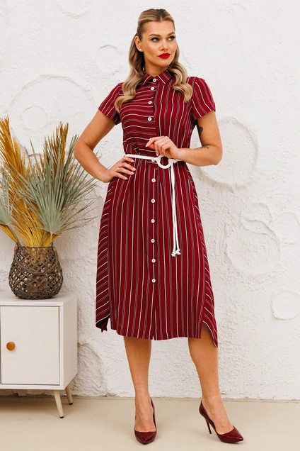 Морской стиль в одежде всегда выглядит элегантно и аккуратно. В летнем сезоне морская тема с многообразием полоски снова популярна. Она будет актуальна в городе и на отдыхе. Платье А-силуэта выполнено из легкой ткани в полоску, на полочках обработаны вытачки, выходящие из бокового шва. Воротник рубашечного типа. Рукав втачной одношовный. Застежка на петли пуговицы. В боковых швах обработаны разрезы. Платье дополнено поясом, что позволяет регулировать ширину по линии талии. длина спинки : 116 см длина рукава: 15,5 см