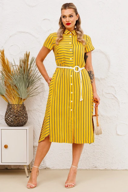 Морской стиль в одежде всегда выглядит элегантно и аккуратно. В летнем сезоне морская тема с многообразием полоски снова популярна. Она будет актуальна в городе и на отдыхе. Платье А-силуэта выполнено из легкой ткани в полоску, на полочках обработаны вытачки, выходящие из бокового шва. Воротник рубашечного типа. Рукав втачной одношовный. Застежка на петли пуговицы. В боковых швах обработаны разрезы. Платье дополнено поясом, что позволяет регулировать ширину по линии талии. длина спинки : 116 см