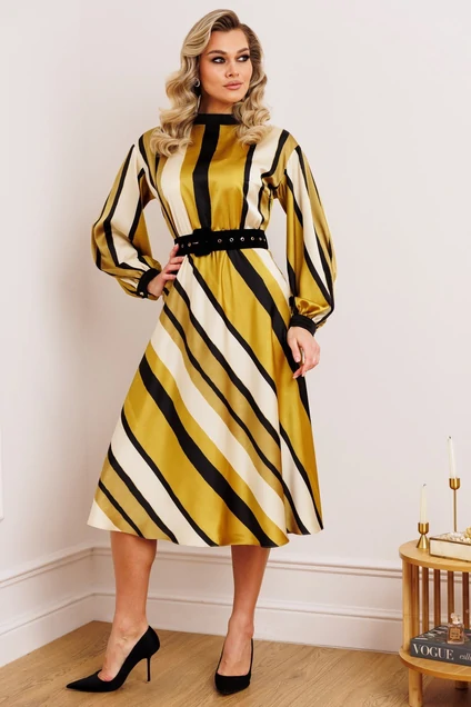 Платье полуприлегающего силуэта, отрезное по линии талии, на резинке. Линия плеча спущена. Рукав рубашечный, расширенный, по низу со сборкой, на притачной манжете. Нижняя часть платья А-силуэта. Верхняя часть спинки со средним швом. Воротник-стойка. Платье дополнено поясом, что позволяет регулировать ширину по линии талии.