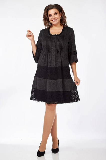 Платье полуприлегающего силуэта из двух видов ткани (ангора, гипюр). Перед и спинка отрезные чуть ниже линии талии. По переду расположены вертикальные защипы (5 штук с каждой стороны). По центру переда отрезная планка, застегнутая доверху на петли и пуговицы. Спинка цельнокроенная с защипами (11 штук). В горловине овальной формы вставка из присборенного гипюра. Юбка состоит из трех воланов (первый волан с гипюром, второй – аногора, третий – с гипюром). Рукав втачной, 3\4 длина, по низу отрезная манжетка, расширенная к низу. Между рукавом и манжетой вставка из гипюра.
