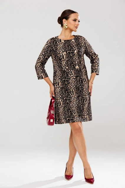 Элегантное, женское платье полуприлегающего силуэта, выполненное из плательно-костюмной ткани (тянется) с актуальным принтом «Леопард». Платье без подкладки. Перед с отрезным лифом, с двубортной застежкой на петли-пуговицы в верхней части. По нижней части переда отделочные клапаны. Горловина округлой формы. Спинка со средним швом и талиевыми вытачками. По плечевым швам – паты на пуговицах.
