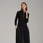 Горловина округлой формы, по верху рукава расположена сборка, низ рукава на резинке. На верхней части спинки расположена центральная застежка на навесные петли-пуговицы. На переде, по центру талии, расположена кулиса с резинкой, отстроченная по краям и переходящая в пояс, который завязывается на спинке. По низу платья волан.