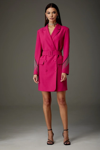 Платье-жакет, прямого силуэта, двубортное с остроугольными лацканами, застежка на пуговицы в два ряда. По переду изделия прорезные карманы с клапаном. Платье полностью на подкладке. На груди имеются вытачки. Рукав одношовный. В кокетку спинки и подрез рукава в качестве декора вставлена металлическая бахрома.