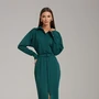 Платье полуприлегающего силуэта, со спущенным плечом, выполнено из трикотажного полотна, отрезное по талии. Верхняя часть переда и спинки более свободной формы. На переде расположена потайная планка на петли-пуговицы до подрезной линии. На левой детали переда в области груди расположена прорезная листочка – обманка. Воротник стояче-отложной с отрезной стойкой. В верхней части переда и спинки заложены односторонние складки, направленные к боковому шву. В нижней части переда расположен переходящий в разрез средний шов. На талии, по переду и спинке расположены вытачки. К платью прилагается пояс из основной ткани. Отделкой в данной модели служит фурнитура контрастного цвета.
