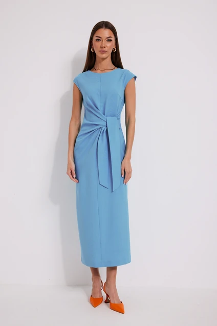 Платье женское, полуприлегающего силуэта, со слегка спущенным плечом. По переду в области талии драпировка, переходящая в завязывающийся пояс. Горловина округлой формы. Спинка со средним швом, в котором сверху потайная молния, снизу разрез, а так же вертикально направленные талиевые вытачки.