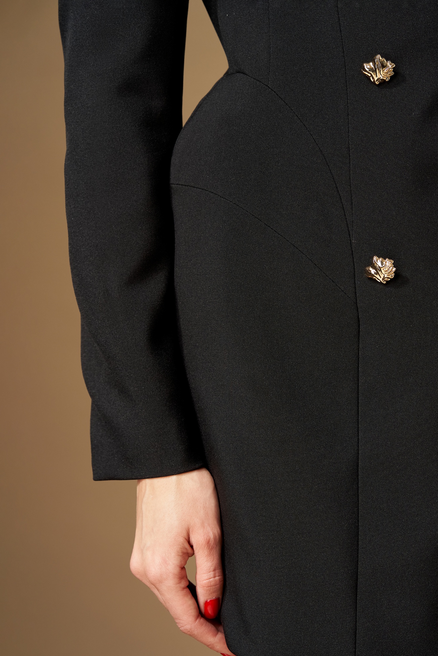 Платье с двубортной застежкой на две пары пуговиц, с фигурным низом. Воротник пиджачного типа. По переду рельеф от плечевого шва, проходящий через центр груди, бочок отрезной из проймы. По спинке средний шов, рельеф от плеча и бочок из проймы. По боковым швам переда и спинки вставлены фигурные подрезы, зрительно расширяющие линию бедер. Рукава втачные, двухшовные, полноценной длины.