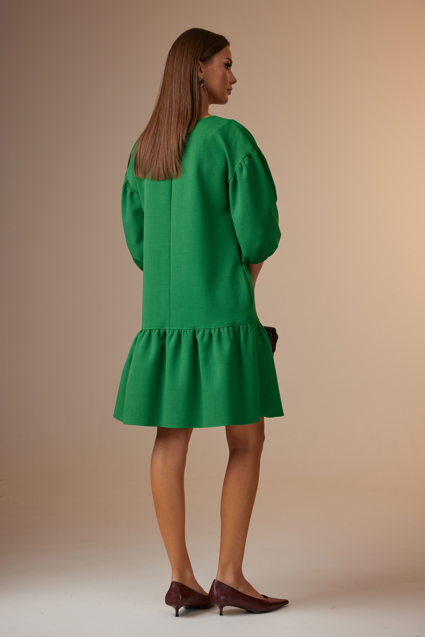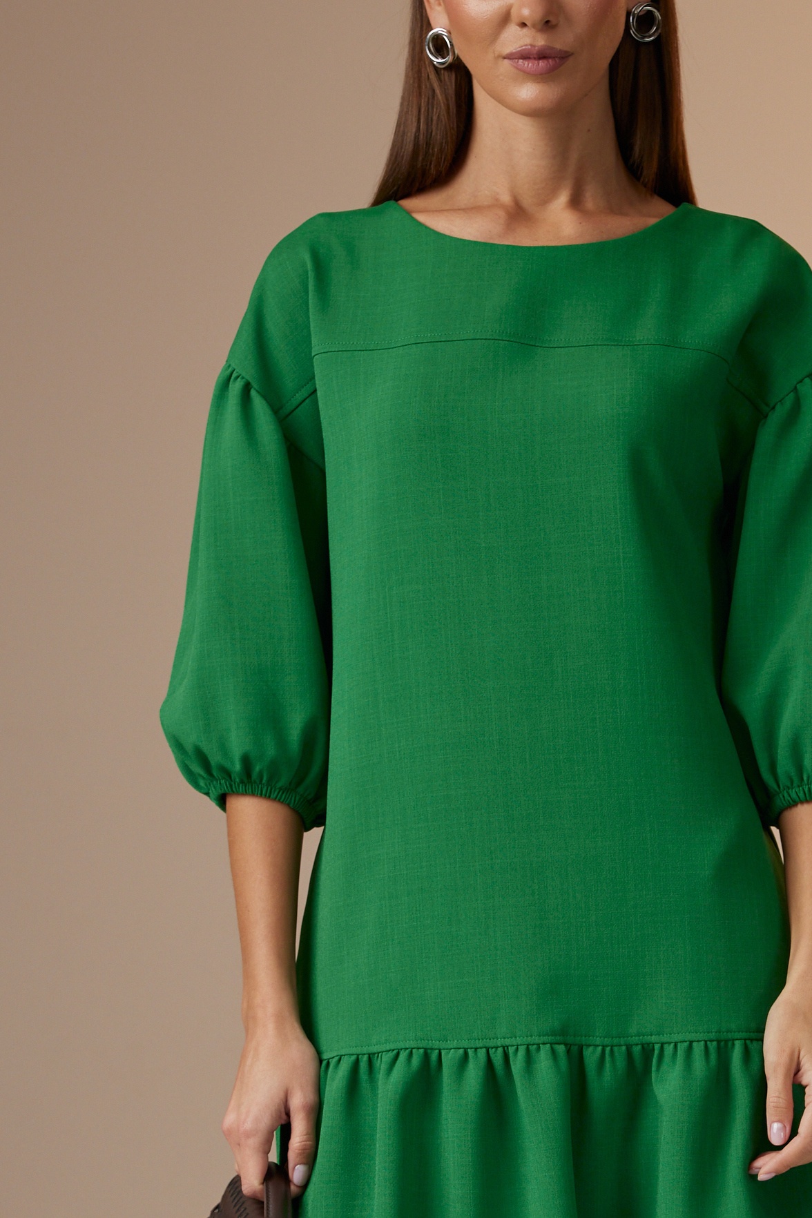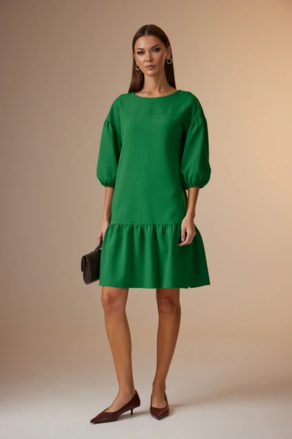 Платье свободной формы, расширенное к низу с помощью волана, покроя спущенное плечо, выполнено из однотонной плательно-костюмной ткани.