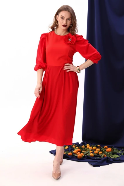 Платье длиной миди, отрезное по линии талии.По переду нагрудные вытачки переведены в талиевые. Лиф спинки со средним швом, талиевыми и плечевыми вытачками, выполнен из костюмной ткани. Юбка со складками на линии талии, расширена к низу. В среднем шве спинки застежка на потайную молнию. Горловина обработана обтачкой. Рукава широкие, втачные,одношовные. По окату рукава заложены мягкие складки. Рукава и юбка платья выполнены из шифона. В комплект к платью идёт съёмная авторская брошь.