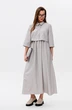 Воздушное платье, состоящее из лифа и юбки, имитирующее костюм-двойку. Лиф прямого кроя с втачным рукавом три четверти. Горловина обработана рубашечным воротником с отрезной стойкой. Застёжка центральная на пуговицы. По талии собрано на резинку. Юбка А-силуэта.