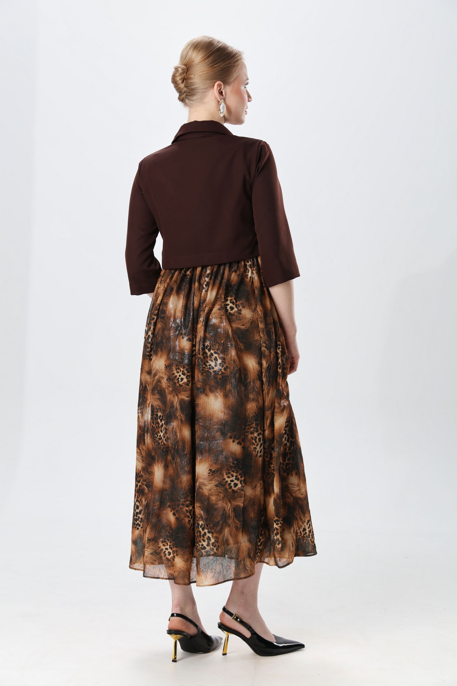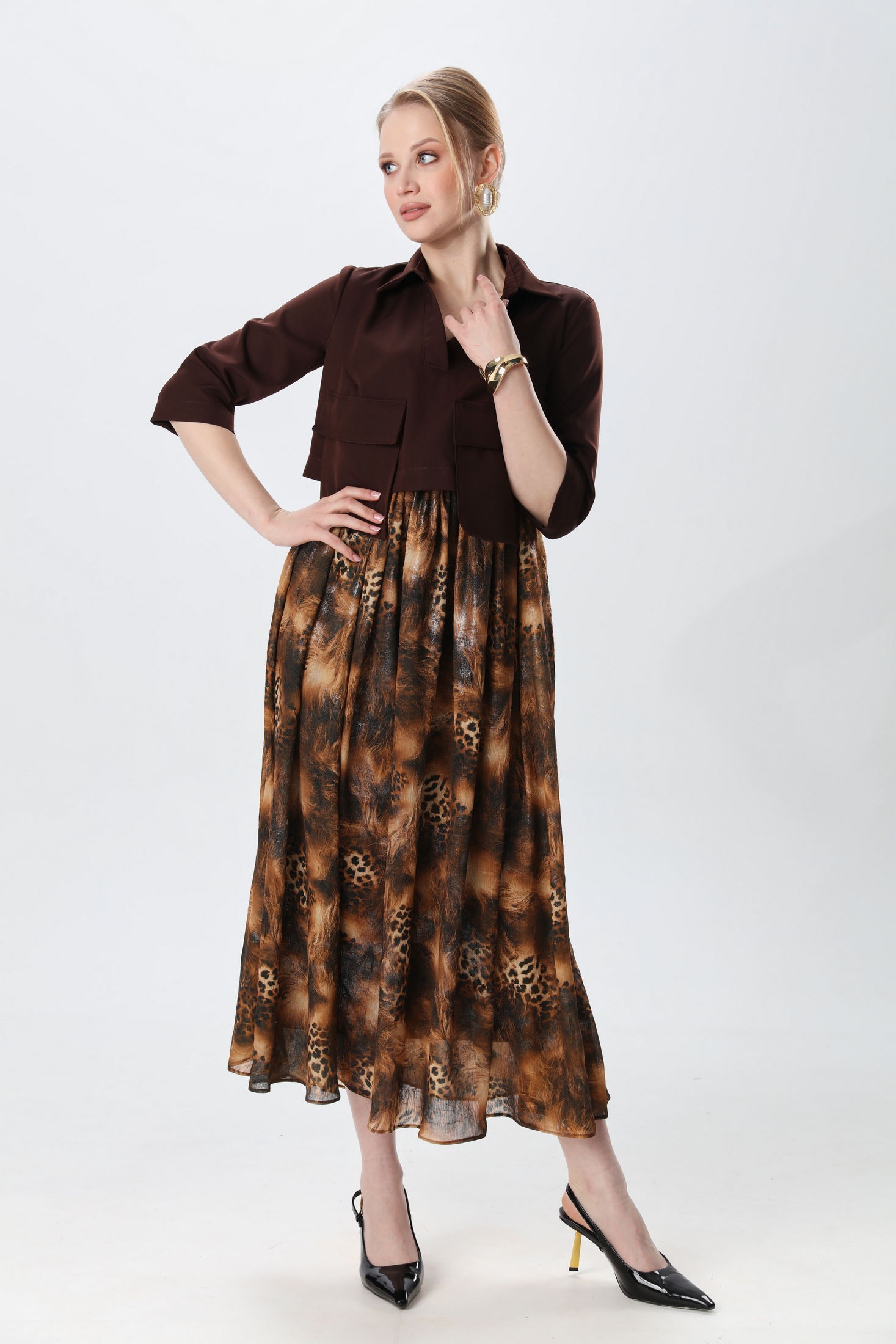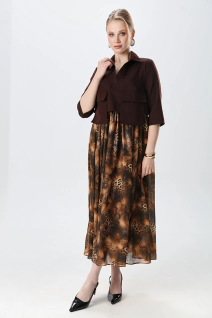 Элегантное платье, состоящее из лифа и юбки, имитирующее костюм-двойку. Лиф прямого кроя с втачным рукавом три четверти и накладными карманами. Горловина обработана рубашечным воротником с отрезной стойкой. Юбка А-силуэта.