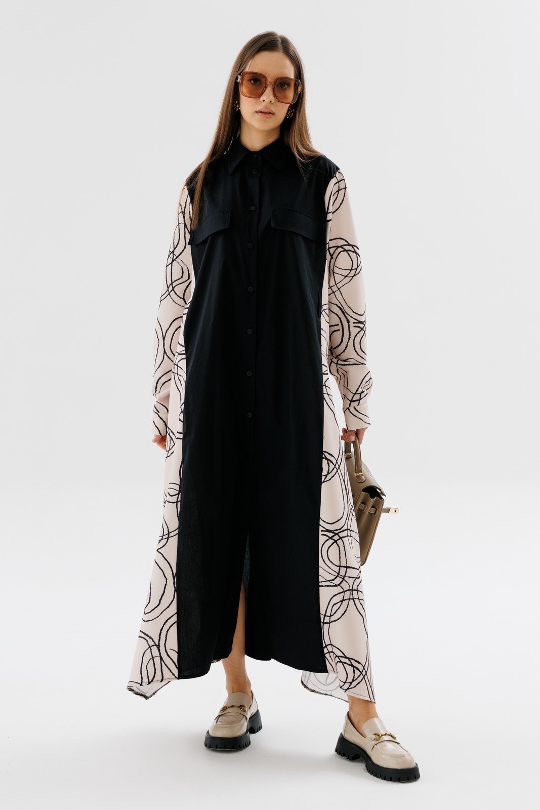 Классическое платье-рубашка прямого кроя в пол. Воротник отложной на стойке. Линия плеча немного приспущена. По груди расположены клапаны. Застёжка центральная на петли и пуговицы. Объёмный рукав с манжетой. Фигурные боковые вставки и рукава из отделочной ткани. Пояс из основной ткани входит в комплект.вставки - 70% вискоза, 27% пэ, 3% эластан