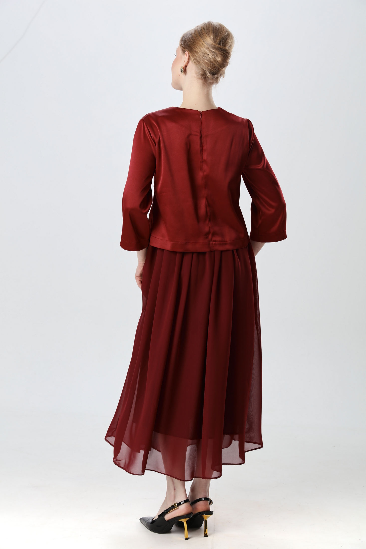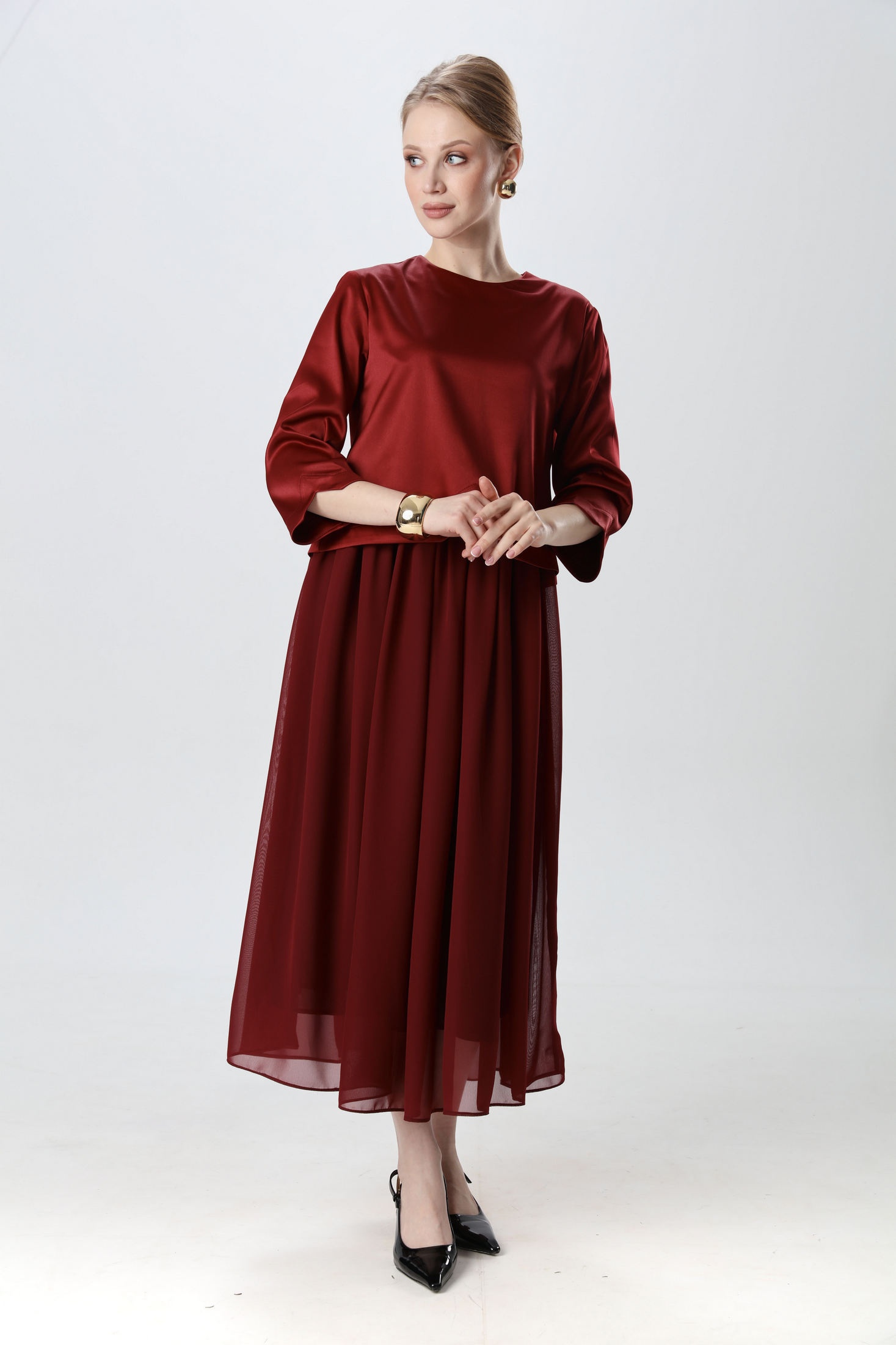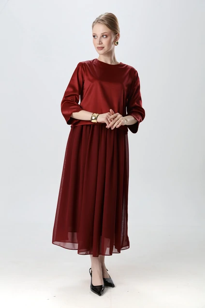 Платье макси комбинированное, двухцветное. Лиф фигурный по низу, выполнен из костюмной ткани. Вырез горловины полукруглый, по спинке затежка на молнию. Рукава втачные. Юбка на резинке, драпирующаяся, расширенного силуэта из шифона. На подкладке.