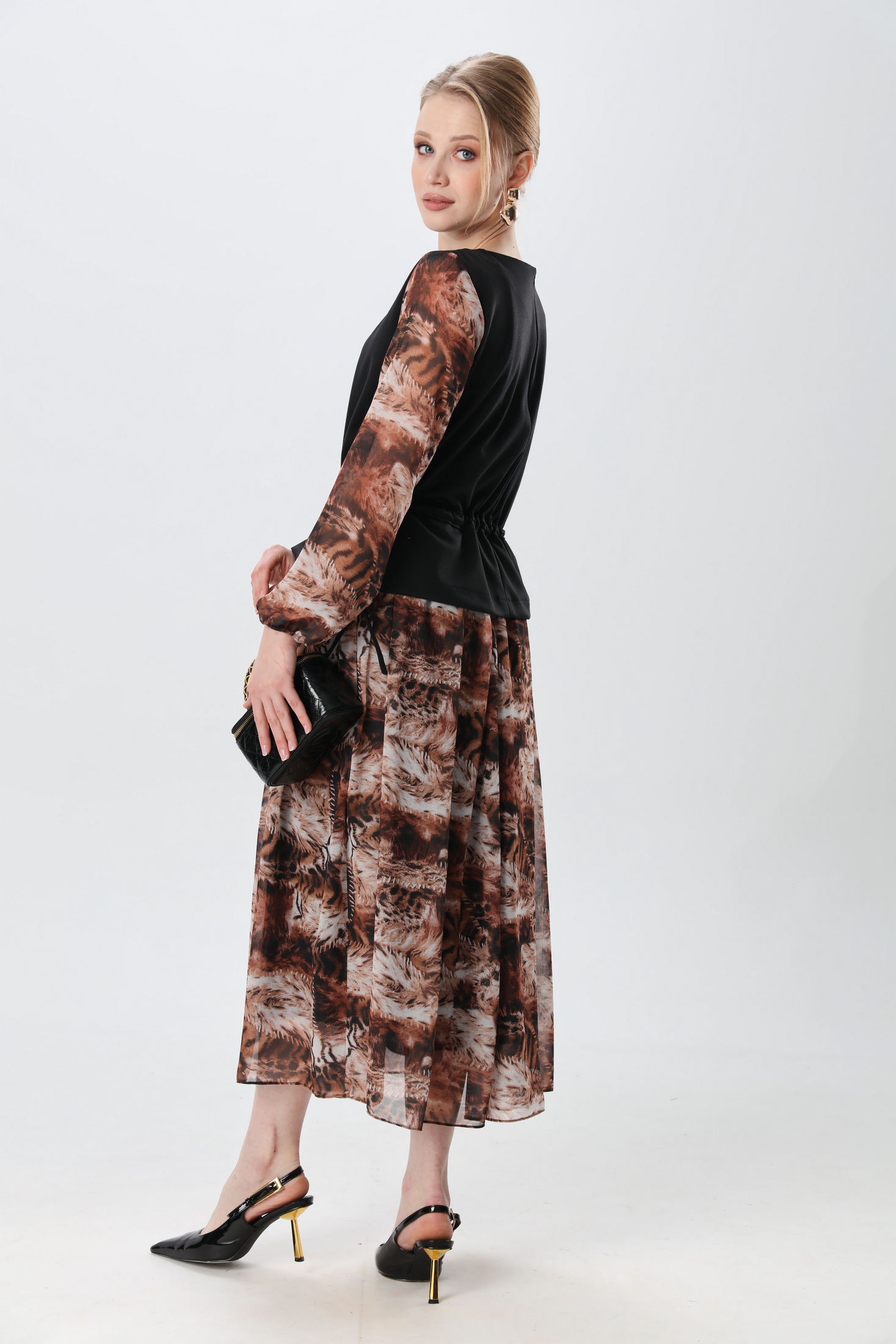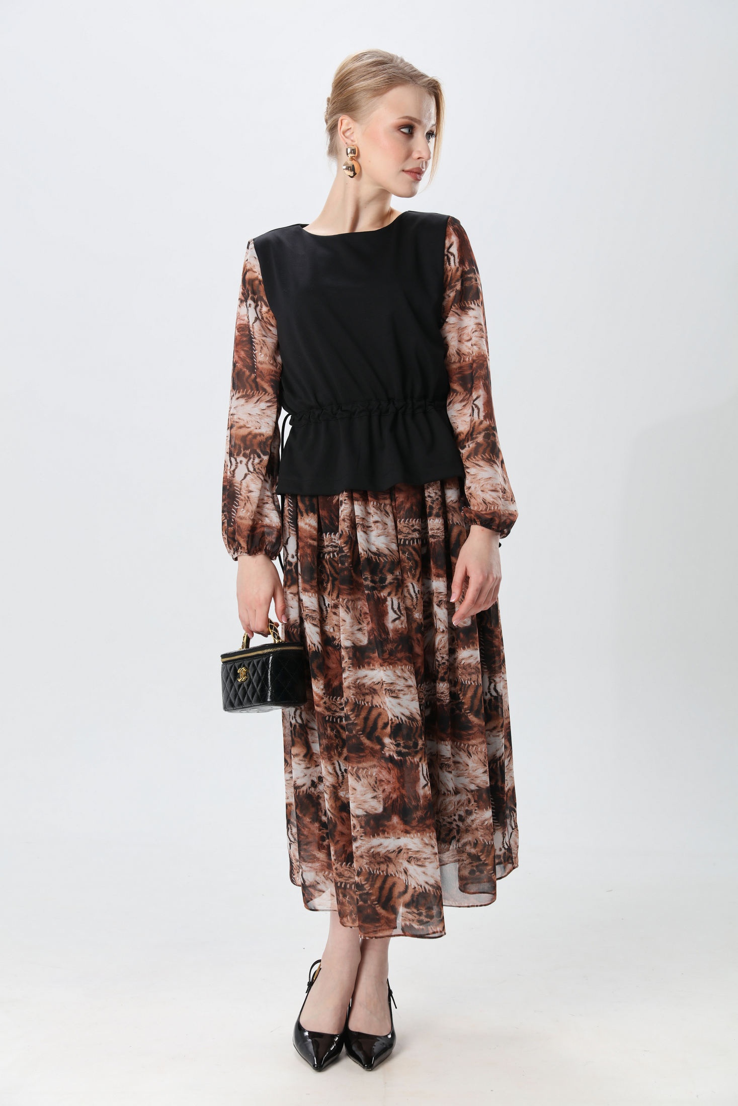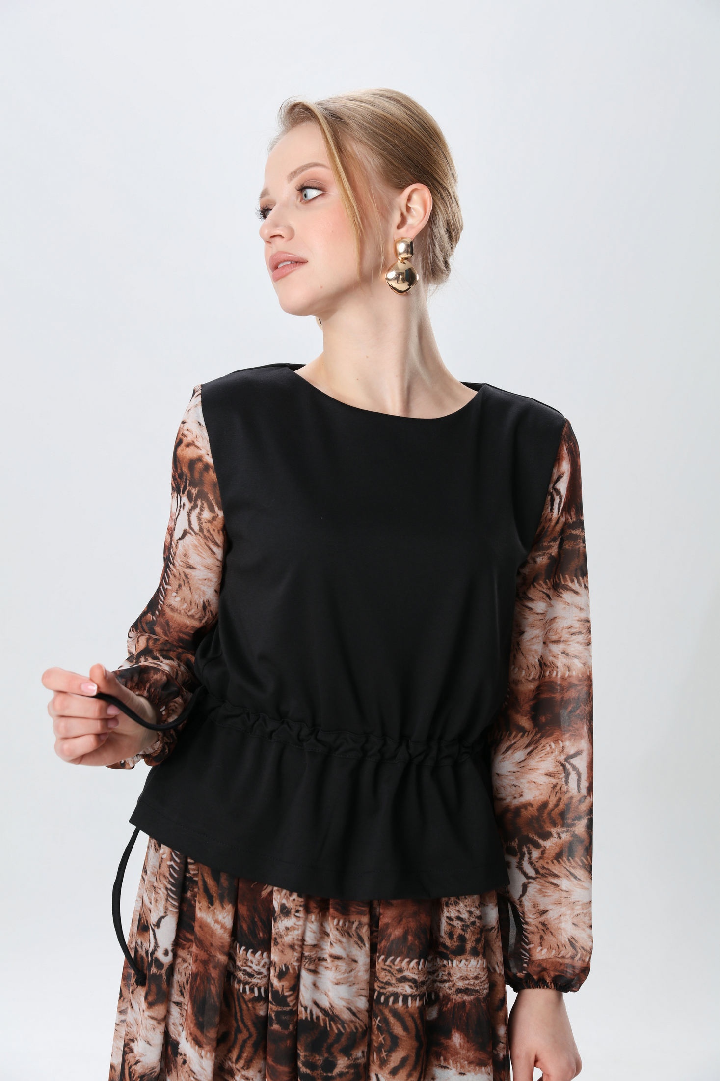 Платье макси комбинированное, двухцветное. Лиф выполнен из трикотажной ткани, от низа переда заложена складка, проходящая через плечевой шов до низа спинки. По линии талии с двух сторон настрочены кулисы с двух сторон со шнурком. Вырез горловины полукруглый. Рукава втачные, собраны на резинку. Юбка на резинке, драпирующаяся, расширенного силуэта.
