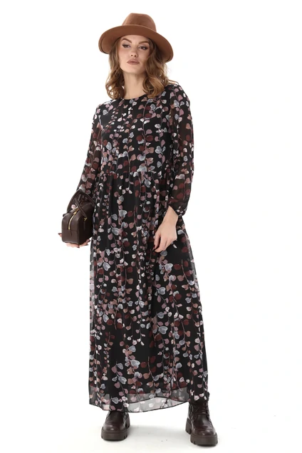 Элегантное макси-платье темно-серого цвета с мелким многоцветным принтом в виде абстрактных кругов и линий, создающих стильный и современный образ. Прямой силуэт этого платья дополнен округлым вырезом и аккуратной отрезной линией по талии, подчеркивающей фигуру. Рукава слегка приспущены, что добавляет нотку расслабленности, а их нижние края собраны на нежные резинки, формируя аккуратные манжеты. Платье выполнено на подкладке для дополнительного комфорта и непрозрачности. Это изысканный выбор для тех, кто ценит утонченность и комфорт в каждой детали.