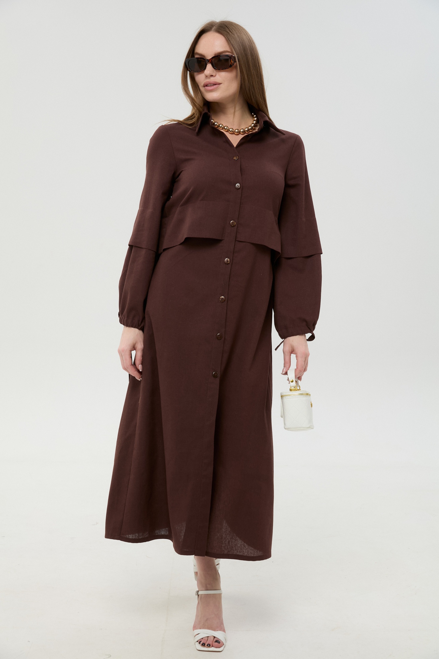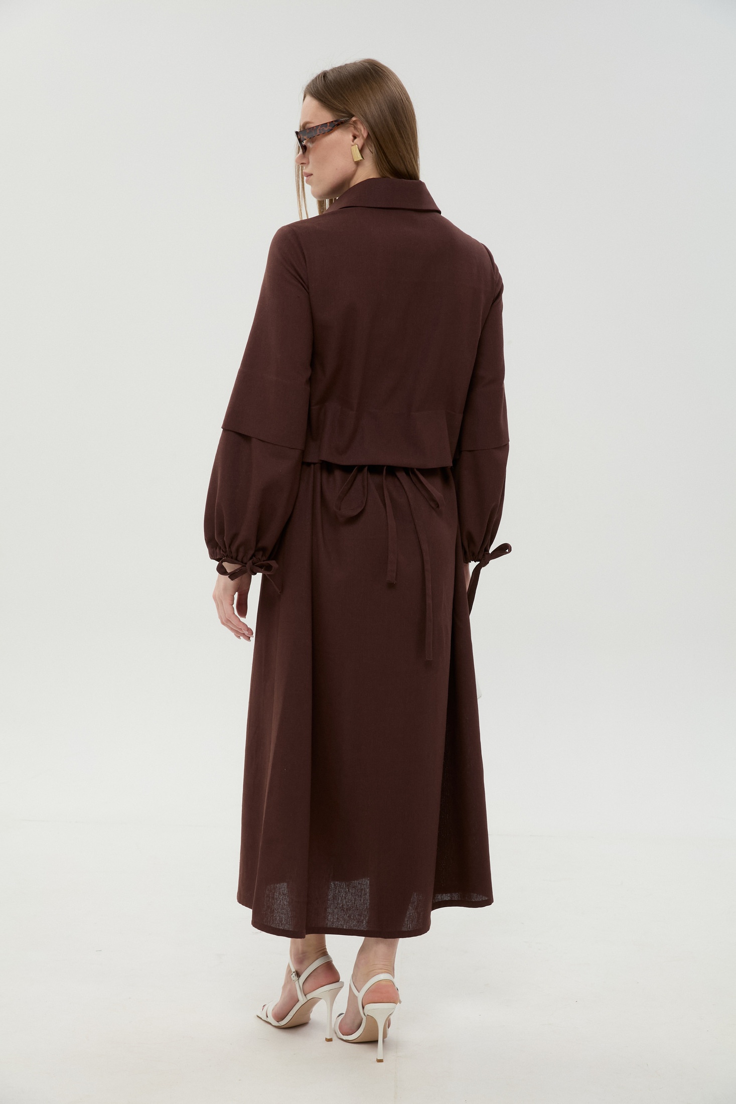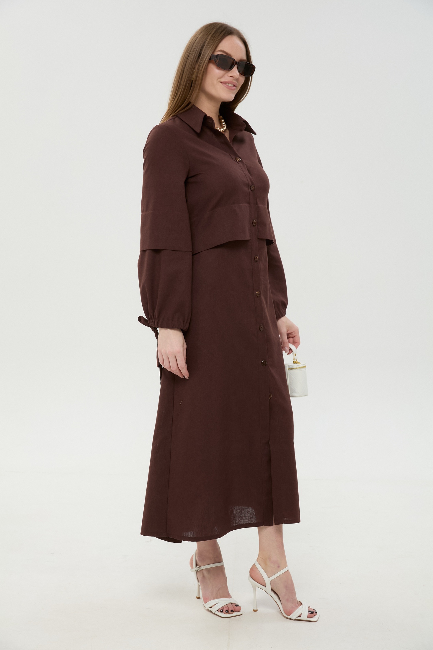Платье 944-16 шоколад от NikVa — это изысканное макси-платье, идеально подходящее для любого сезона. Коллекция бренда NikVa представляет модель из смеси льна, вискозы и хлопка, обеспечивая комфорт и лёгкость. Центральная отрезная застёжка на потайную планку с пуговицами добавляет практичности, а цельнокроеные складки на талии подчёркивают силуэт. Втачные рукава с завязками на манжетах и стояче-отложной воротник добавляют изюминку. Шоколадный цвет и длинна платья делают его универсальным для работы и отдыха, а пояс из основной ткани позволяет легко регулировать посадку.