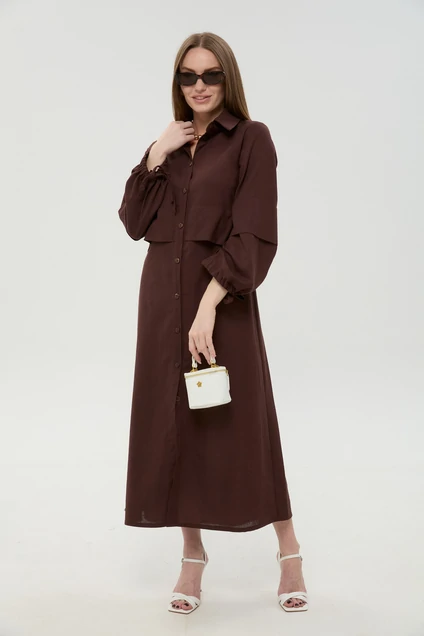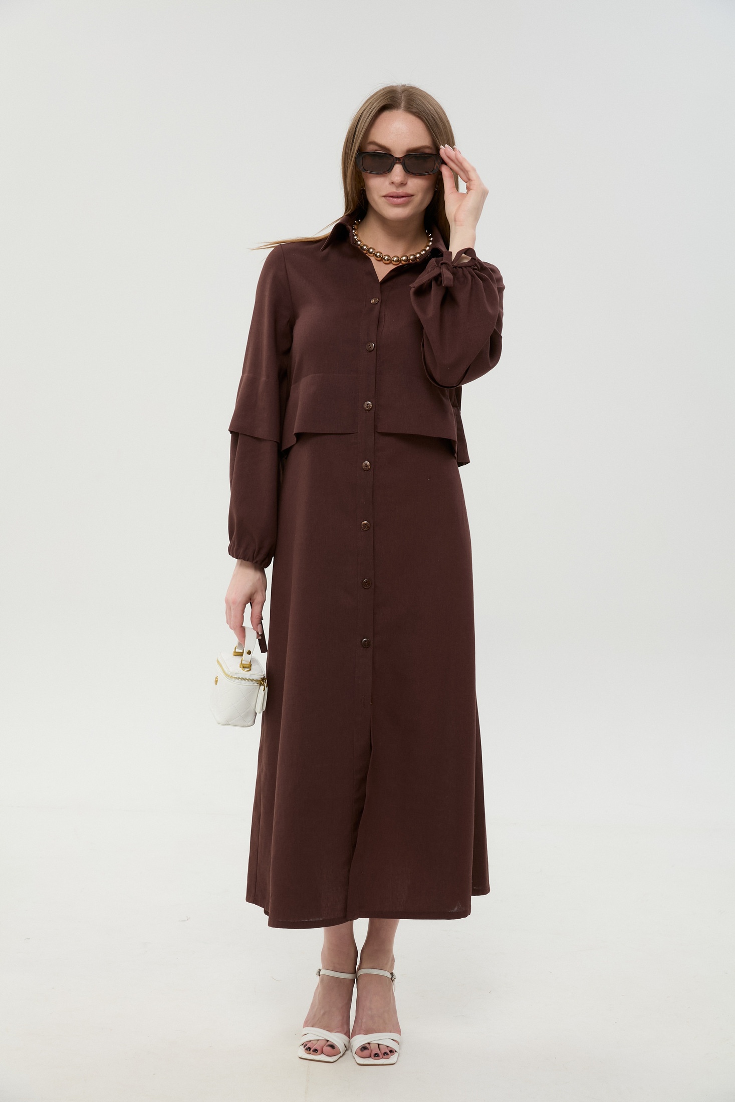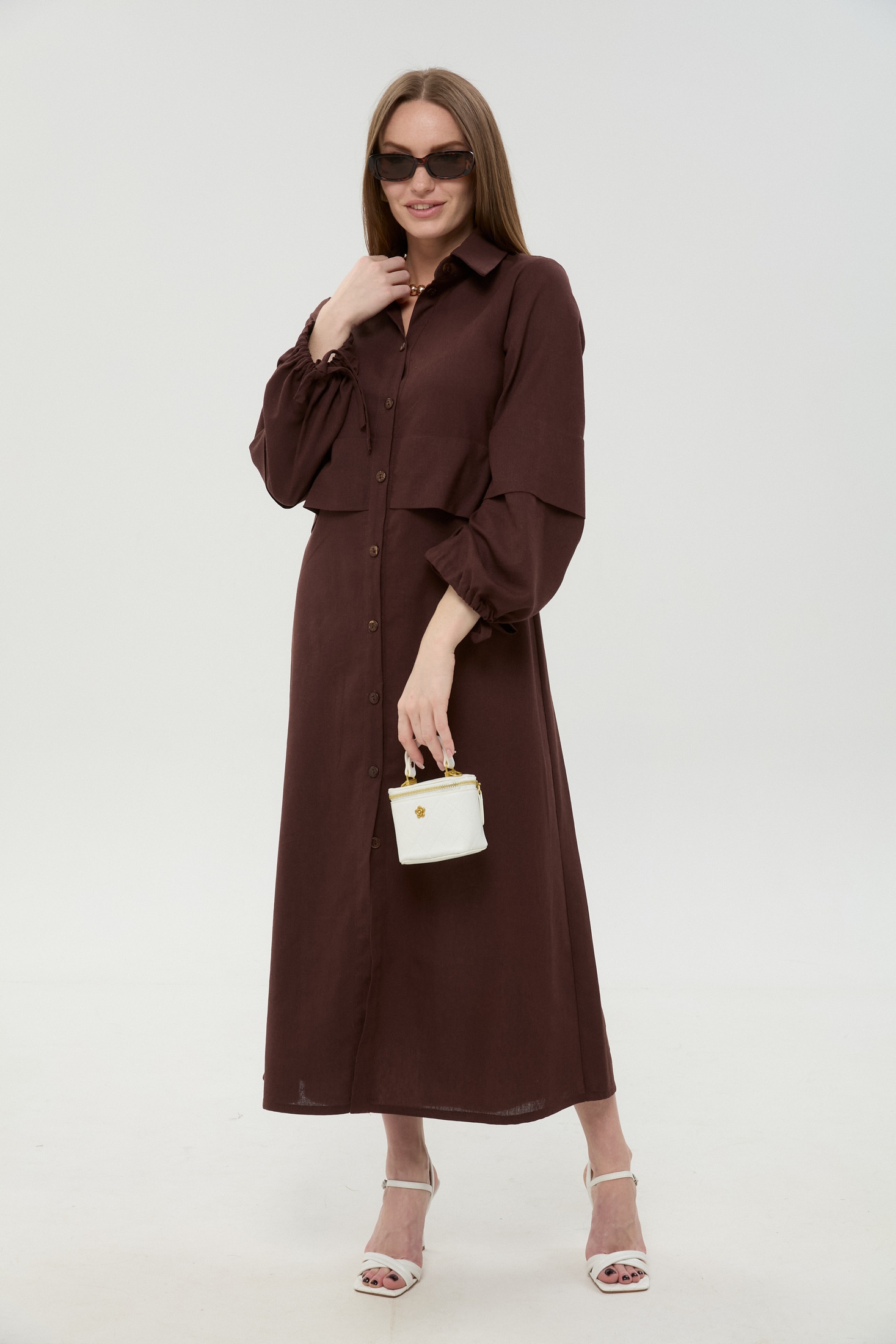 Платье 944-16 шоколад от NikVa — это изысканное макси-платье, идеально подходящее для любого сезона. Коллекция бренда NikVa представляет модель из смеси льна, вискозы и хлопка, обеспечивая комфорт и лёгкость. Центральная отрезная застёжка на потайную планку с пуговицами добавляет практичности, а цельнокроеные складки на талии подчёркивают силуэт. Втачные рукава с завязками на манжетах и стояче-отложной воротник добавляют изюминку. Шоколадный цвет и длинна платья делают его универсальным для работы и отдыха, а пояс из основной ткани позволяет легко регулировать посадку.
