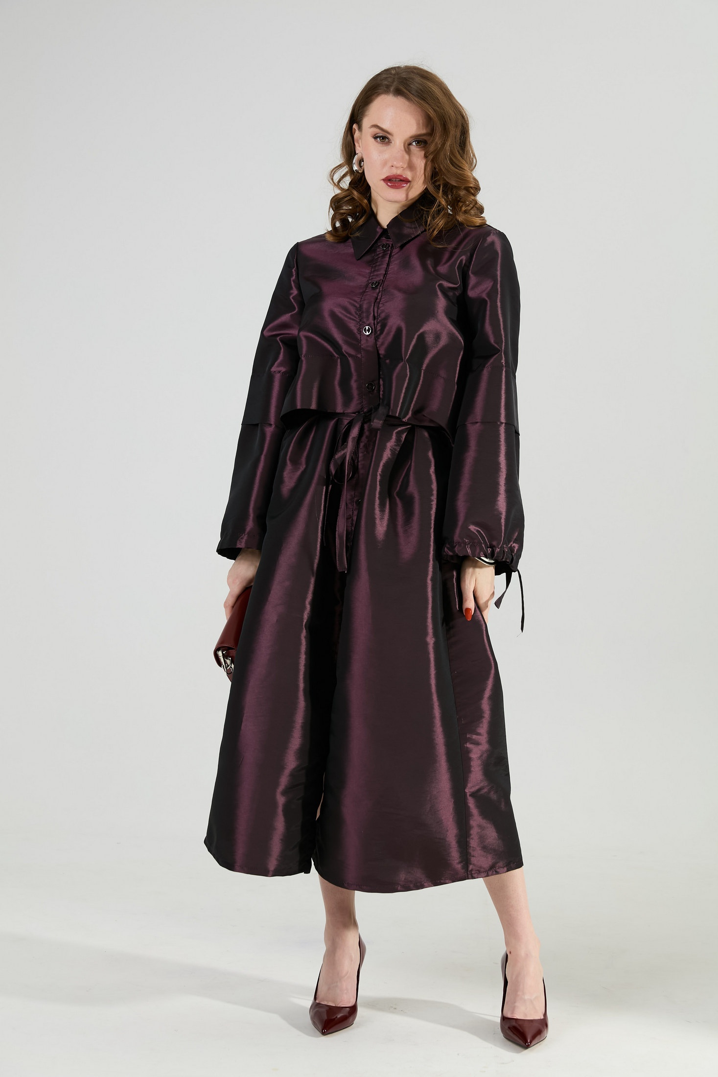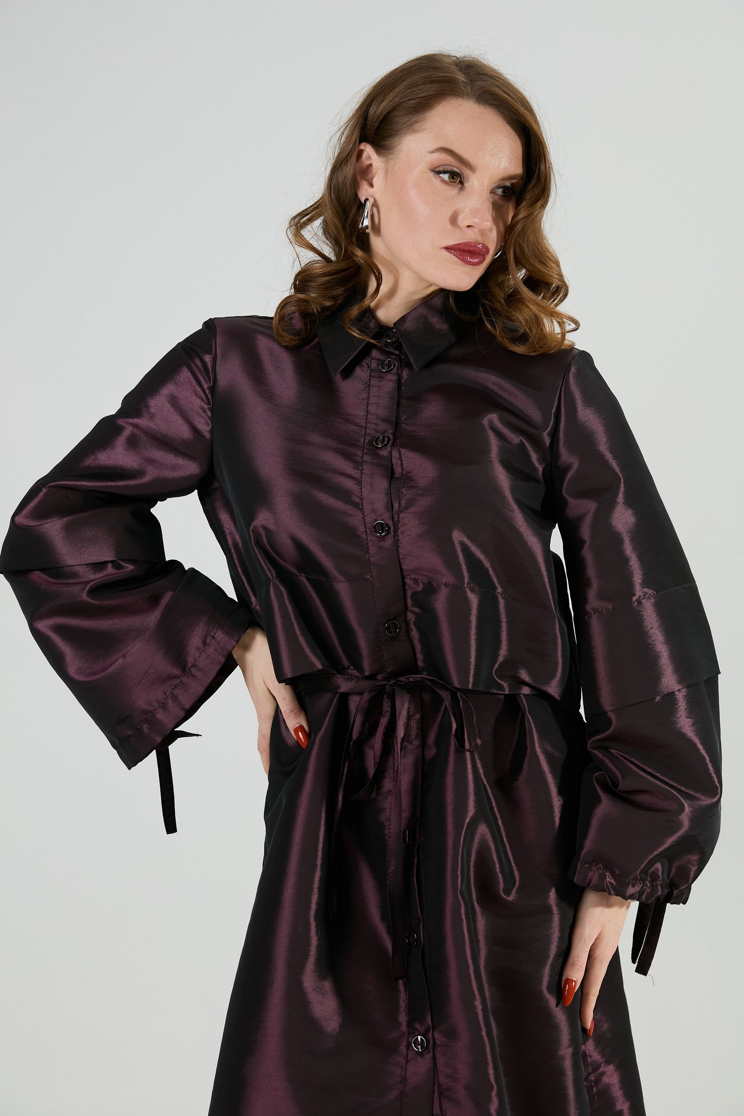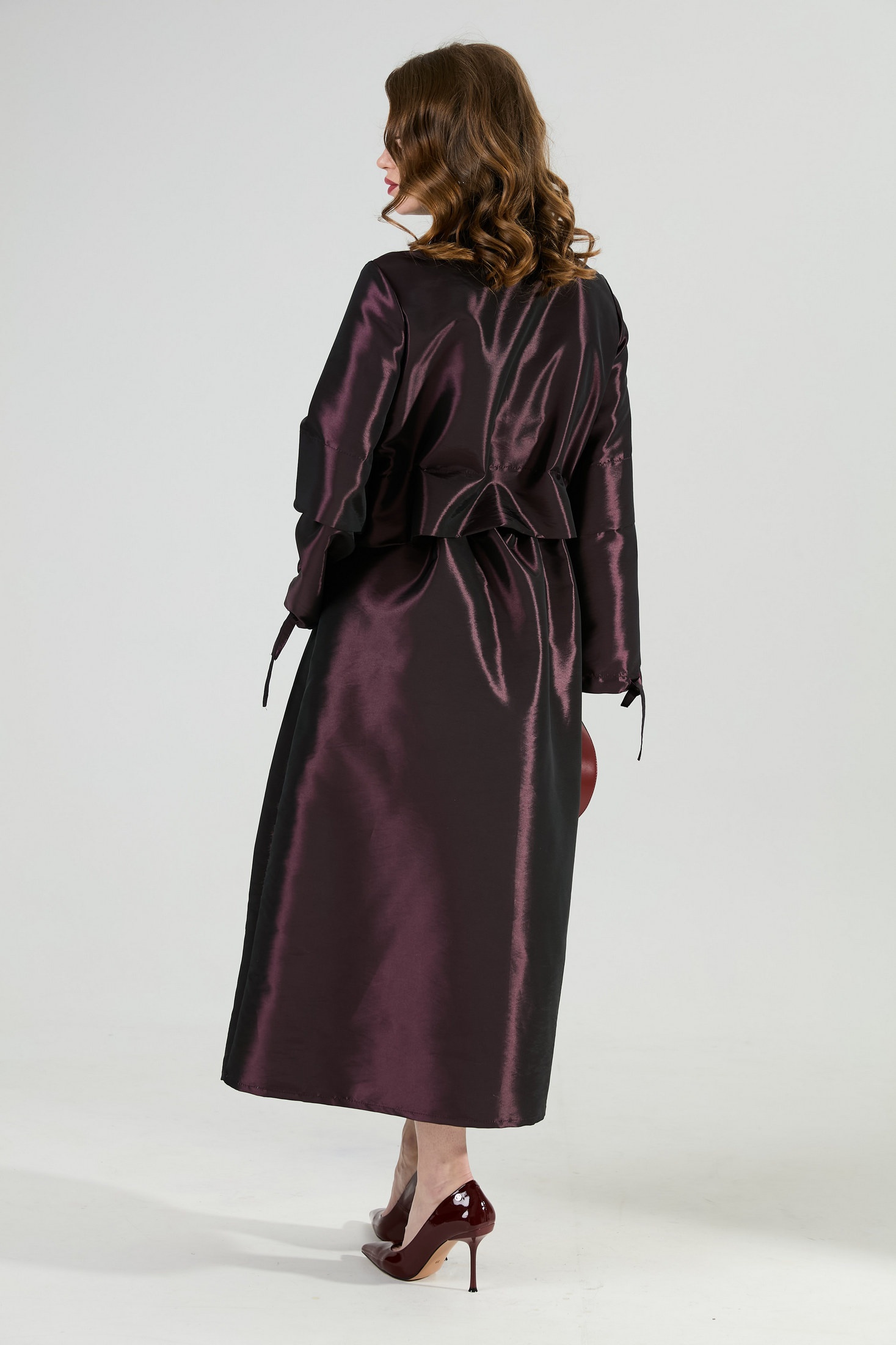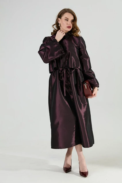 Платье макси с центральной отрезной застёжкой на центральную застежку на петли и пуговицы.По переду и спинке цельнокроеные складки на уровне талии. Рукав втачной,одношовный рубашечного типа. По низу рукава пробиты петли и вставлена завязка для фиксации сборки . Воротник рубашечный стояче отложной. В комплект идёт пояс из основной ткани.