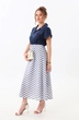 Комбинированное платье, состоящее из лифа и юбки. Лиф прямого кроя с коротким цельнокроеным рукавом с манжетой. Горловина обработана рубашечным воротником с отрезной стойкой. Застёжка центральная на петли и пуговицы.По полочке имитация нагрудных карманов с клапанами. Линия талии собрана на резинку. Юбка А-силуэта на подкладке.