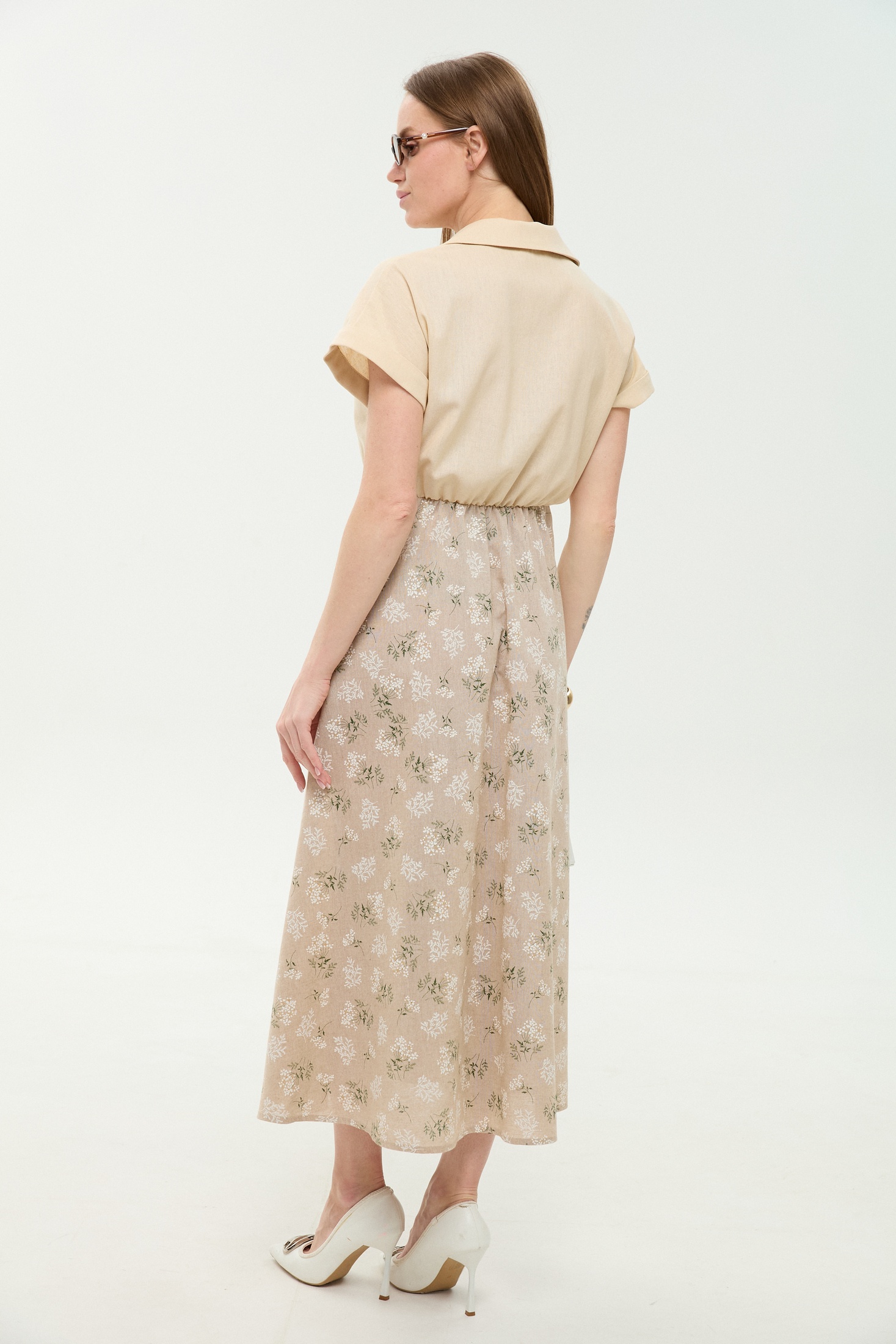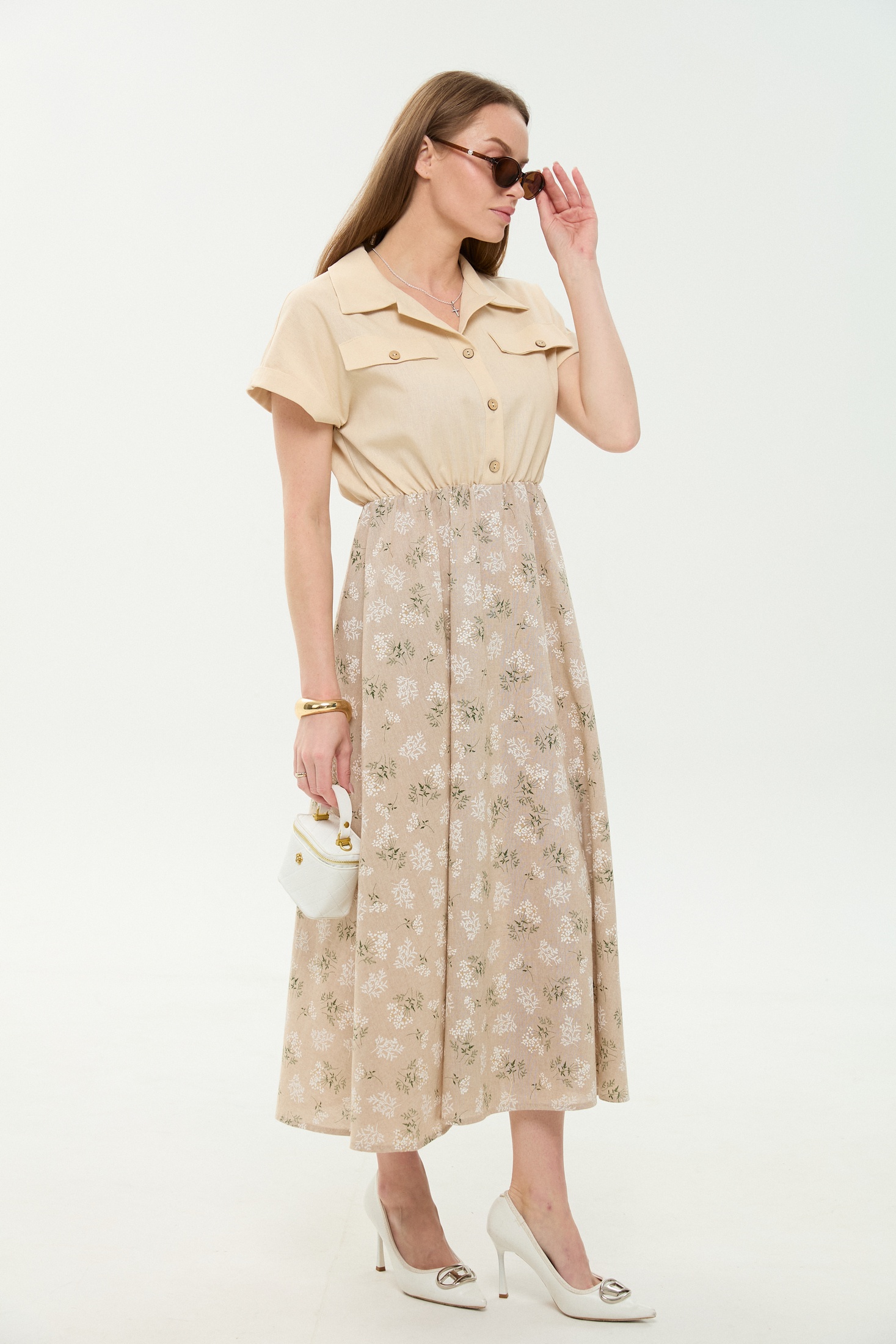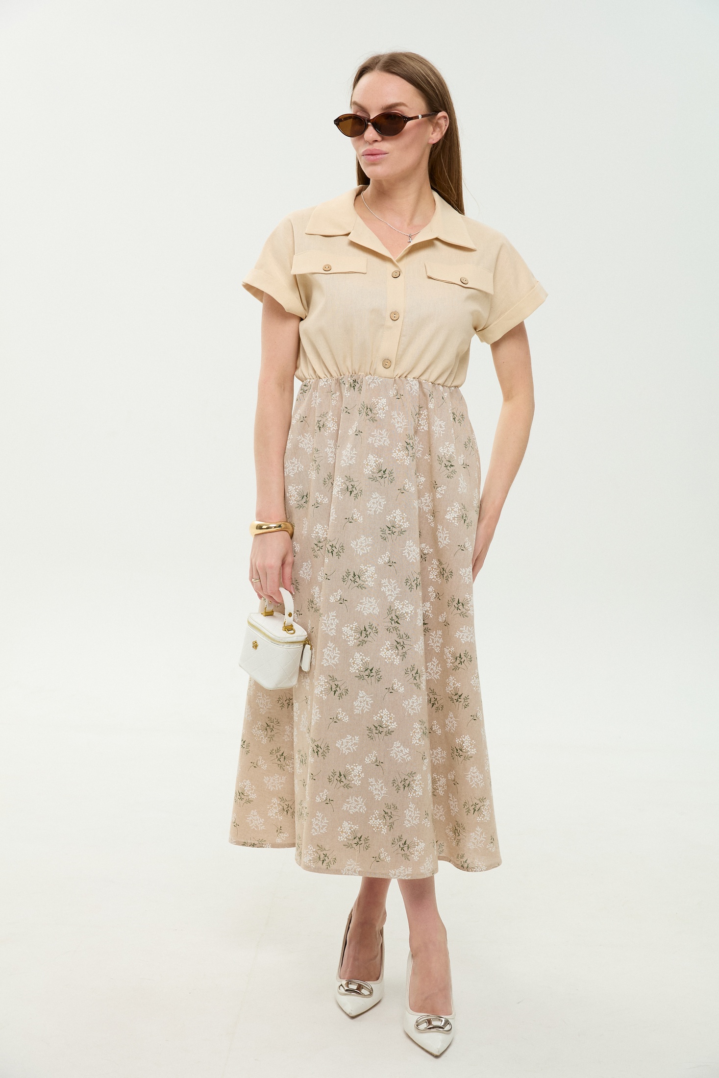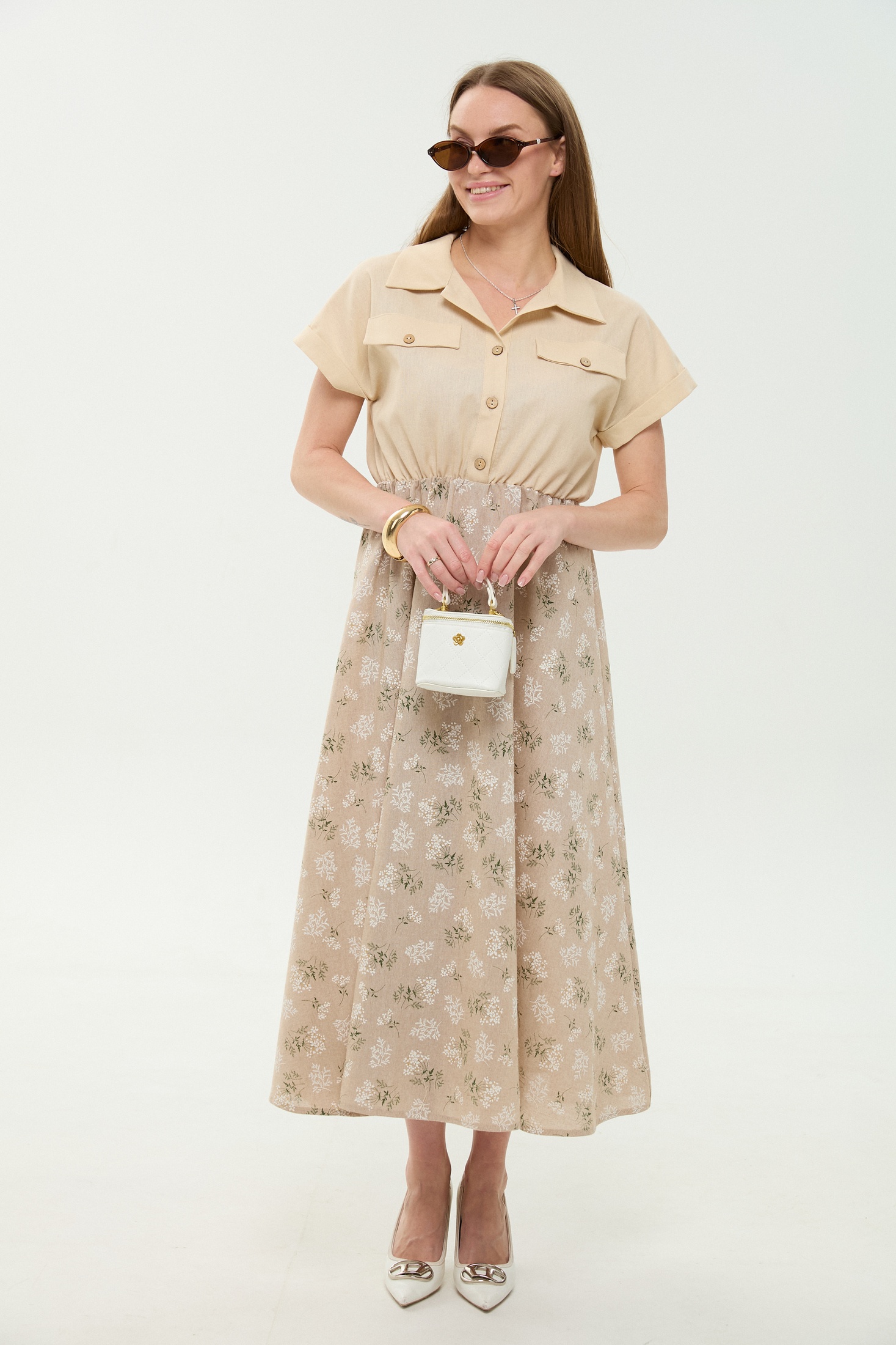Платье 969-4 песочный + песочные цветы NikVa привлекает внимание своими нежными песочными тонами и изящным цветочным узором. Коллекция бренда NikVa акцентирует внимание на комфортных и стильных деталях. Изготовлено из комбинации льна, вискозы и хлопка, платье обладает лёгкостью и дышащими свойствами, идеально подходящими для летнего сезона. Прямой крой лифа и короткие рукава с манжетами создают лаконичный силуэт, подчёркнутый резинкой на талии. Рубашечный воротник с центральной застёжкой на петли и пуговицы придаёт образу элегантность. Юбка А-силуэта добавляет женственности и утонченности. Это платье станет отличным выбором для повседневного гардероба и отдыха благодаря своей универсальности и комфортному фасону. Светлый цвет добавляет свежести вашему образу.