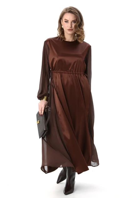 Платье длиной макси комбинированное, свободного кроя, расклешенное к низу. Перед состоит из центральной и боковой части. Спинка с притачной кокеткой, центральной и боковыми частями. На переде и спинке по линии талии настрочена кулиска, с регулировкой прилегания с помощью шнура. Рукав втачной длинный. Горловина изделия круглой формы.