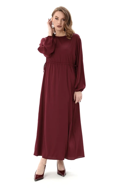 Платье длиной макси комбинированное, свободного кроя, расклешенное к низу. Перед состоит из центральной и боковой части. Спинка с притачной кокеткой, центральной и боковыми частями. На переде и спинке по линии талии настрочена кулиска, с регулировкой прилегания с помощью шнура. Рукав втачной длинный. Горловина изделия круглой формы.