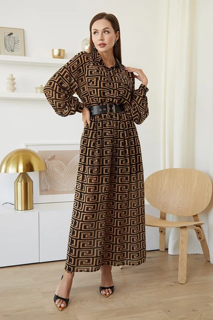 Платье из струящегося креп-шифона, отрезное по линии талии. Верх изделия с накладными карманами и клапанами. Центральная застежка на декоративные пуговицы. Нижняя часть платья - широкая юбка, собранная на сборку вверху. Дополнительно в шов по талии вставлена резинка. Боковые швы немного смещены к центру. В них расположены карманы. Спинка прямая. Платье длиной до косточек. Спущенная линия плеча. Объемный рукав. Низ рукава на притачной манжете. Рубашечный воротник.