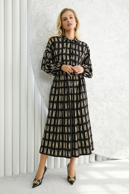 Платье из струящейся вискозы, отрезное по линии талии, без подкладки. Центральная застежка на декоративные пуговицы до линии талии. Нижняя часть платья - широкая юбка, собранная на сборку вверху. Дополнительно в шов по талии вставлена резинка. Спинка прямая. Платье длиной до середины икры. Спущенная линия плеча. Объемный рукав. Низ рукава на резинке. Рубашечный воротник.