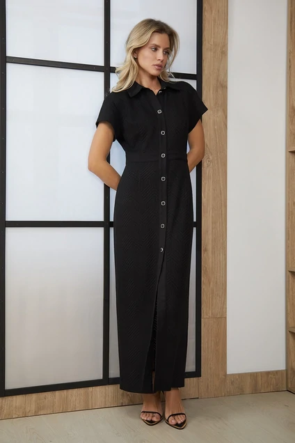 Платье выполнено из трикотажного вискозного полотна. Машинная вязка. Изделие полуприлегающего силуэта, длиной маxi. По центру платья отрезная планка , выполнена из отделочной ткани. Застежка центральная на петли и пуговицы. По линии талии отрезная деталь из отделочной ткани. По спинке и полочке изделия нагрудные и талиевые вытачки. Спущенная линия плеча, Короткий рукав-“крылышко”. Рубашечный воротник.