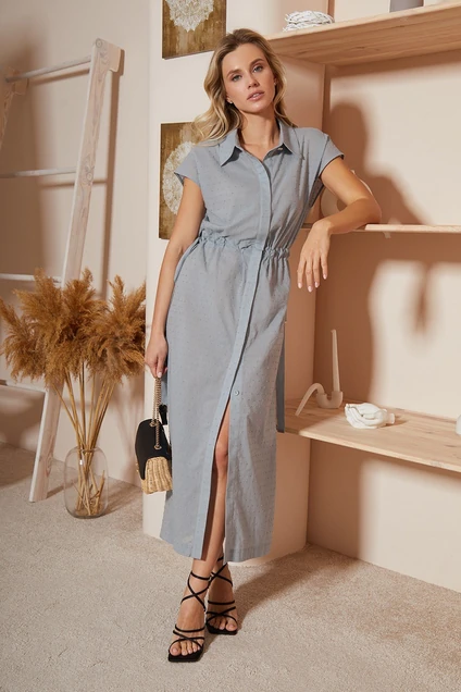 Платье прямого силуэта , выполнено из тонкого фактурного хлопка. Длина маxi. Центральная потайная застежка на петли и пуговицы. Застежка доверху. Спинка прямая. По талии декоративная кулиса, в которую вставлена хлопковая тесьма. Изделие регулируется по линии талии. Спущенное плечо, переходящее в рукав. Воротник рубашечный. Изделие без подкладки.