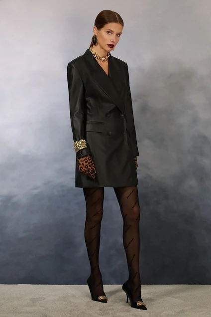 Платье- жакет полуприлегающего силуэта, чуть расширенное книзу, на вискозной подкладке. Изделие с двубортной застежкой на петли и пуговицы. Воротник пиджачного типа. На полочках нагрудные вытачки, отрезные бочки и прорезные карманы в рамку с клапанами. Борта прямые. Спинка прямая со средним швом и талиевыми вытачками. Втачной длинный рукав.