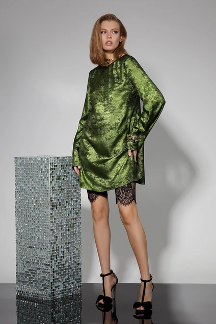 Стильное платье длиной выше колена, немного расширенное книзу. Свободное в талии и бедрах. Втачной длинный рукав, расширенный книзу. Горловина круглая. Глубокий вырез на спинке, который фиксируется завязками в области лопаток. Платье без подкладки.