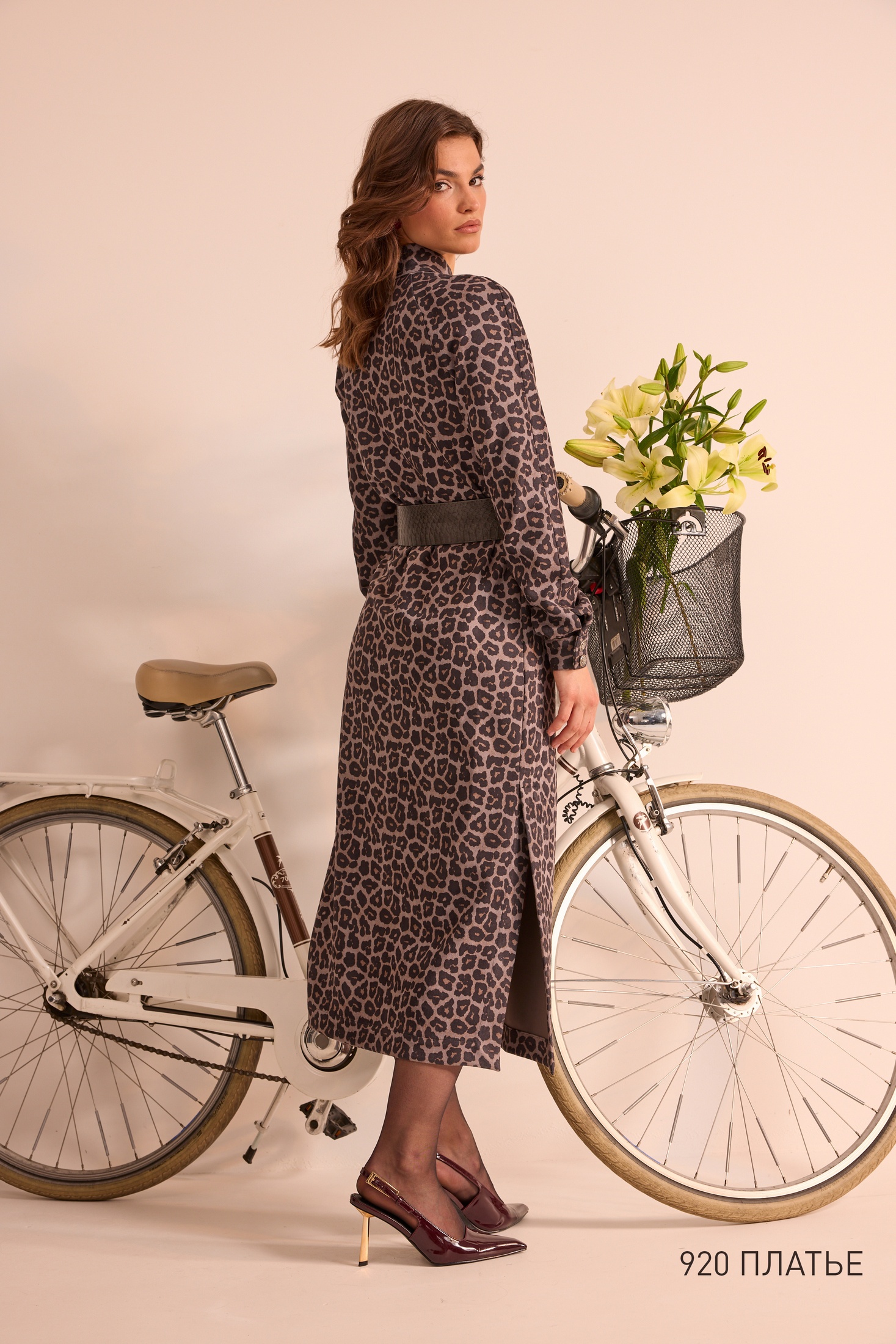Элегантное платье миди-длины из нежной замши, оформленное в современный анималистичный принт с тонкими оттенками серого и черного. Прямой крой платья подчеркивает женственность и удобство, делая его идеальным выбором как для офиса, так и для вечерних выходов. Горловина декорирована планками с оригинальными дизайнерскими пуговицами, добавляющими изюминку в общий дизайн. В комплекте с платьем идет пояс, который подчеркивает талию, обеспечивая изысканную и структурированную силуэт.