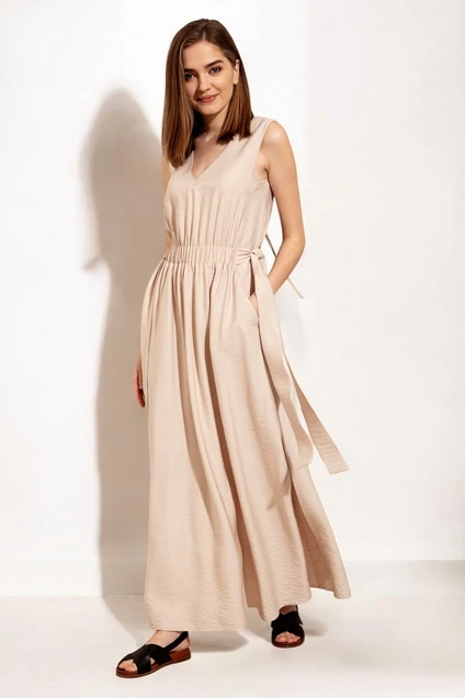 Стильное длинное платье из струящейся вискозной ткани с V-образным вырезом по переду и спинке. По линии талии обработана широкая кулиса со сборкой и завязками по бокам. По низу платья обработаны разрезы в боковых швах.