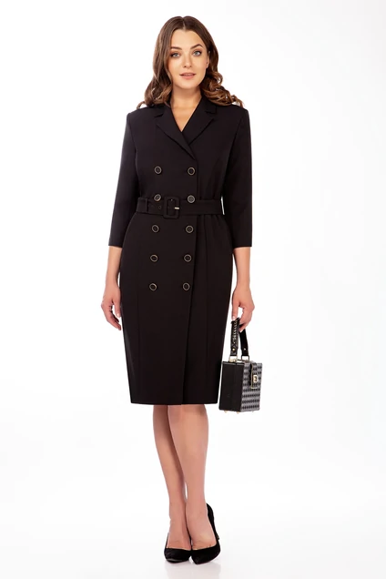 Платье женское, повседневное, двубортное, полуприлегающего силуэта, с втачными рукавами, длиной до линии колена, с застежкой на 5 петель и 5 пуговиц и 1 петлю и пуговицу до перегиба лацканов. Детали переда платья с рельефными швами от проймы до низа. Деталь спинки платья со средним швом и талиевыми вытачками. Рукава втачные двухшовные, длиной ¾, с локтевым и передним швами, локтевые швы заканчиваются разрезом. Воротник отложной пиджачного типа. Углы воротника и лацканов острые. Длина изделия Длина спинки – 103см.