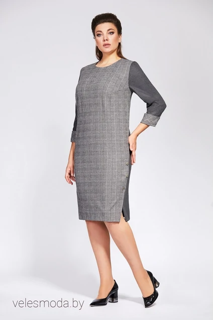 Платье из плотного трикотажного полотна зауженное к низу, перед выполнен из отделочной ткани клетка с боковыми швами уходящими на перед платья, в швах расположены карманы и шлицы с декоративными пуговицами,