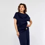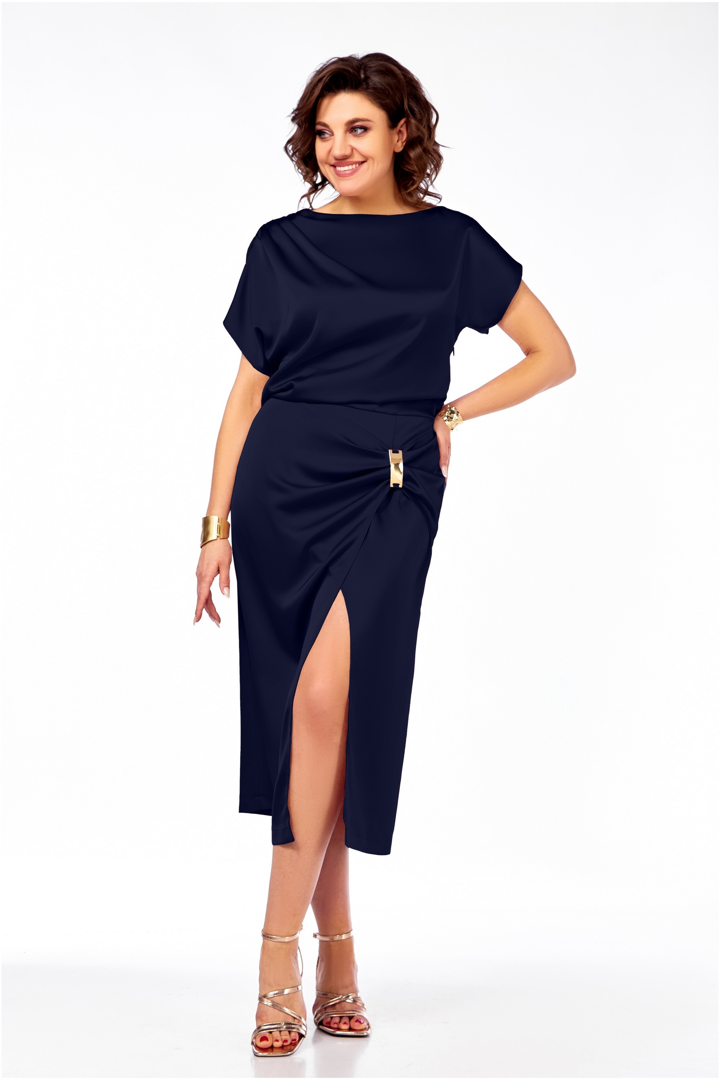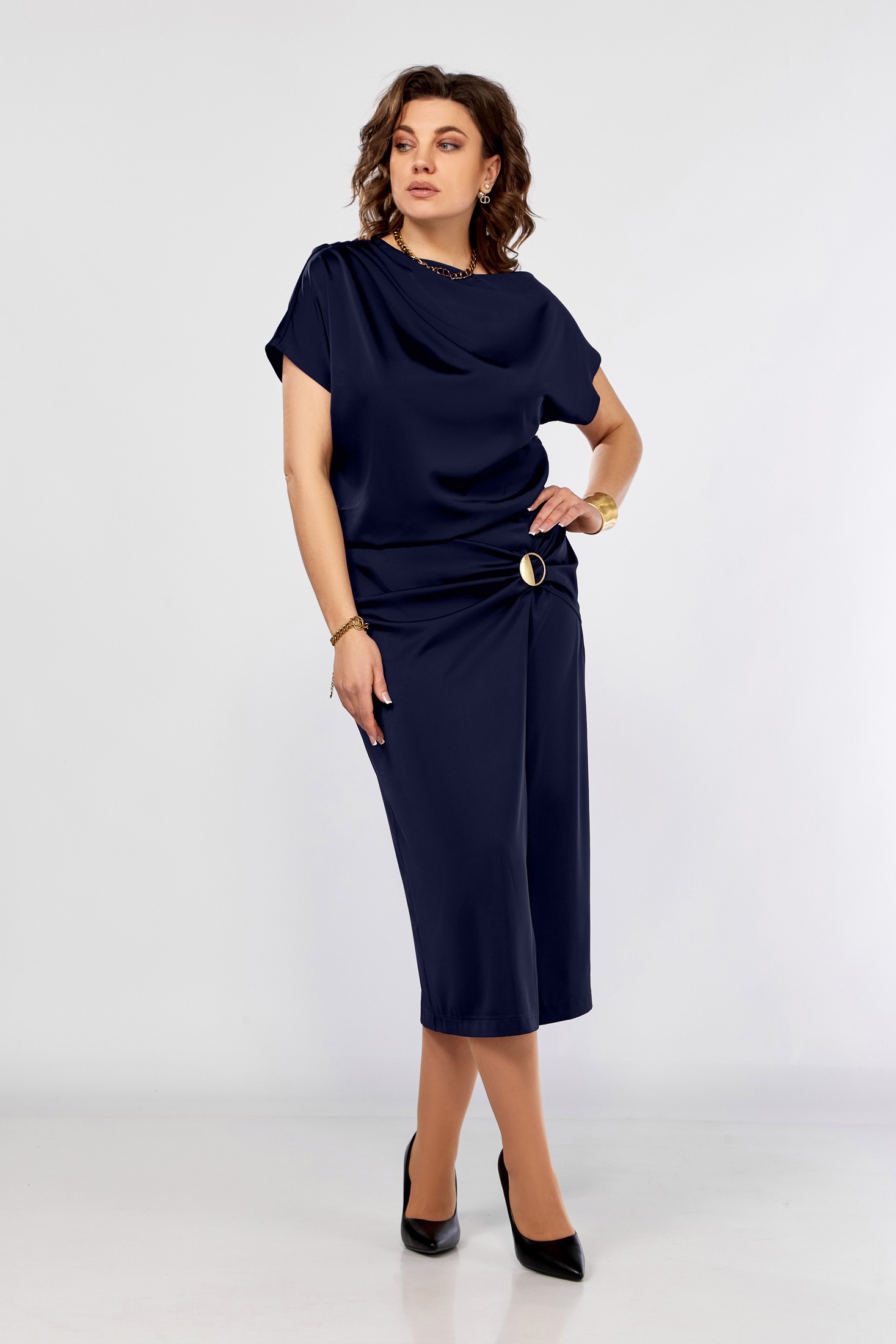 Шикарное нарядное платье, полуприлегающего силуэта из струящейся ткани с цельнокроеным рукавом, коротким, ассиметричного силуэта. Платье отрезное по талии, с молнией потайной в боковом шве. По плечевому шву по переду и спинке заложены складки. Нижняя часть с разрезом, декоративной не сьемной пряжкой. Талия присобна на резинку. Длина платья 130 см