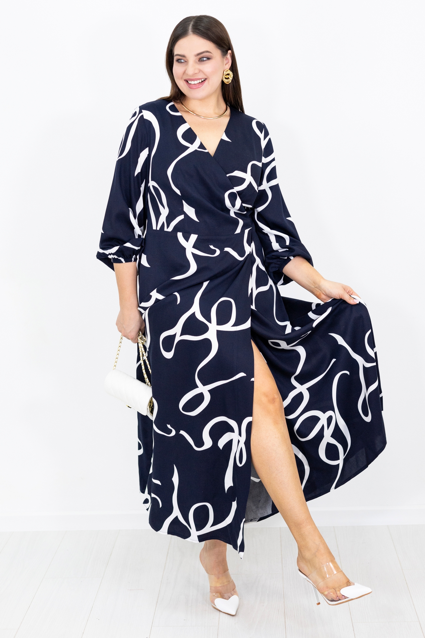 Нарядное женское платье длинной макси с фиксацией на запах. Силуэт полуприлегающий, с юбкой силуэта трапеция. Модель выполнена из шлифованной вискозы с ярким двухцветным принтом. Вырез горловины V-образный, углубленный, что визуально удлиняет шею и делает область декольте изящнее. Вытачки нагрудные от горизонтального подреза. Рукав втачной, длинный. Низ рукава плавно расширен и присобран на резинку. Юбка летящая, плавно ниспадающая по бёдрам. Пояс притачной, фиксируется на бант.