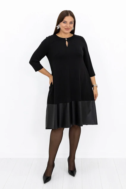 Платье женское, длиной миди. Силуэт трапеция. Модель выполнена из костюмно-плательного трикотажа с отделкой из искусственной кожи. Вырез горловины округлый. По переду средний шов с вырезом у горловины и декоративной пуговицей. Вытачки нагрудные из боковых швов. Волан притачной из искусственной кожи. Длина платья разноуровневая. Плавное скругление низа с удлинением по спинке. Рукав втачной,7/8 (длиной за локоть). Спинка со средним швом и воланом из искусственной кожи. Швы и строчки выполнены в он изделия.