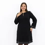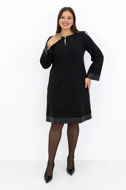 Платье женское, длиной миди (чуть выше колена). Силуэт полуприлегающий в верхней части и юбкой с расширением трапеция к низу. Модель выполнена из костюмно-плательного трикотажа с отделкой из искусственной кожи. Вырез горловины округлый. Под линией груди фигурный горизонтальный подрез, от которого вверх выходят нагрудные вытачки. По переду средний шов с вырезом у горловины и декоративной пуговицей. Рукав втачной длинный, с небольшим расширением к низу. Низ рукавов и низ изделия оформлен притачной планкой из искусственной кожи. Швы и строчки выполнены в тон изделия.