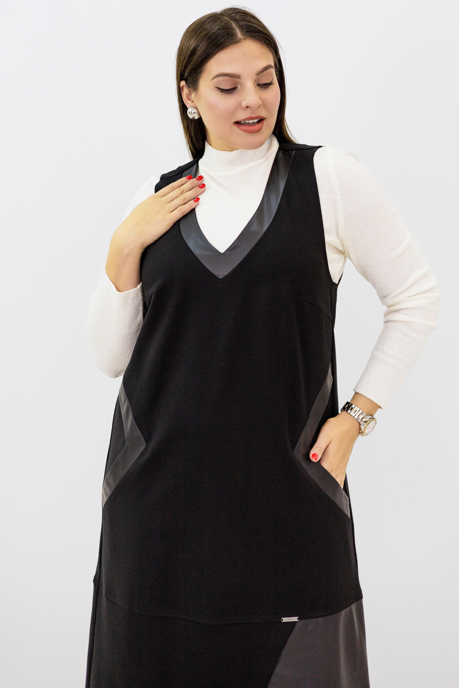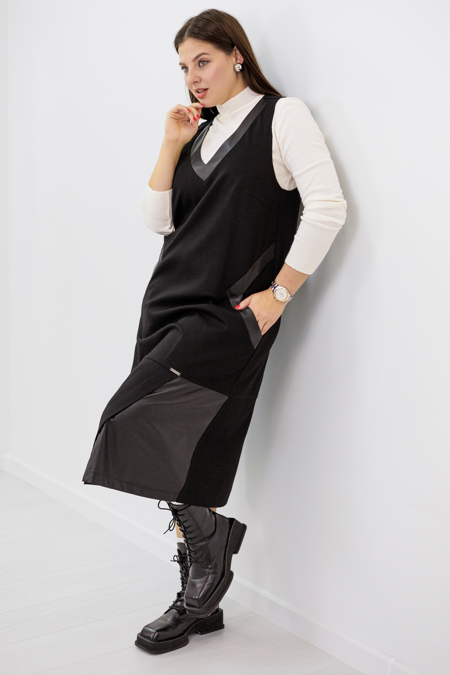 Модный сарафан женский длиной миди. Модель выполнена из плотного трикотажного полотна с отделкой из искусственной кожи. Нижняя часть трикотажного сарафана отрезная , ассиметричная, с эффектом запаха. Модель без подкладки. Вырез горловины сарафана с кожаными вставками углубленный, V-образный. Фигурная обтачка горловины выполнена из отделочной ткани. Пройма заниженная, что позволяет носить сарафан с блузкой, рубашкой или любым лонгсливом. Для лучшей посадки на фигуре предусмотрены нагрудные вытачки. Сарафан имеет карманы в боковых швах. Отделка кармана выполнена из искусственной кожи. Спинка со средним швом.