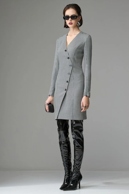 Платье полуприлегающего силуэта, втачного покроя с двубортной ассиметричной застежкой на петли-пуговицы. Платье укороченное, выше колена. Горловина V-образной формы.