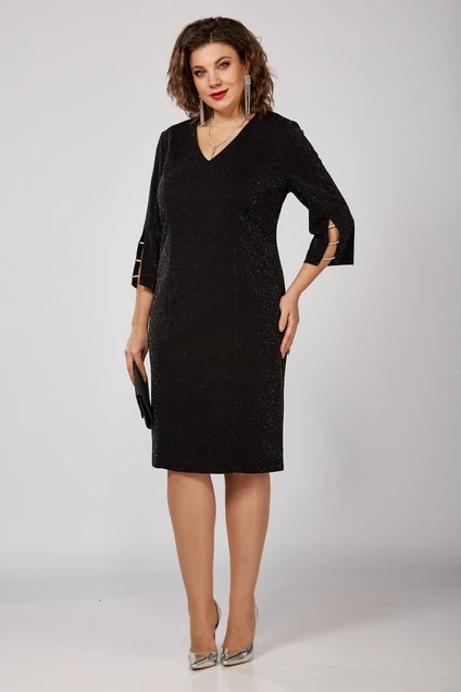 Платье полуприлегающего силуэта втачного покроя. Платье выполнено из трикотажного полотна с люриксовой нитью. Горловина V-образной формы. На переде расположены вертикальные рельефы, идущие из проймы. Спинка со средним швом, в котором расположены молния и шлица, так же на спинке расположены талиевые вытачки. Рукава ¾, к низу расширены, с декоративной тесьмой.