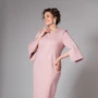 Платье женское полуприлегающего силуэта, втачного покроя рукава. Выполнено из трикотажного полотна с принтом по низу изделия и низу рукава. Горловина округлой формы. По переду по центру расположена имитация застежки на цельнокроеную планку, на петли-пуговицы, переходящая в шлицу. На лицевой стороне платья расположены нагрудные вытачки, идущие из боковых швов. Горловина округлой формы. Спинка цельная, с талиевыми вытачками. Рукав длинный, одношовный.
