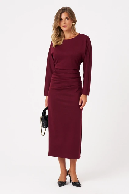 Женское платье из мягкого трикотажа идеально подойдет для повседневной носки. Модель отрезная по линии талии, что создает аккуратный и женственный силуэт. На переднем полотнище в боковом шве расположены защипы и разрез, добавляющие образу изящества и удобства. Спинка выполнена со средним швом и оснащена потайной застежкой-молнией в шве для комфортного надевания. Длинные цельнокроеные рукава обеспечивают дополнительный комфорт и стильный вид. Длина платья — макси, оно выполнено в бордовом оттенке, что делает его универсальным и легко сочетаемым с различными аксессуарами и обувью.