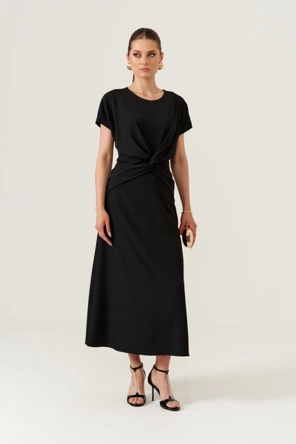 Это женское платье из поливискозной ткани, подходящее как для повседневной носки, так и для торжественных мероприятий. Модель отрезная по линии талии и выполнена в полуприлегающем силуэте, что обеспечивает комфортную посадку и элегантный силуэт. Лиф переда украшен средним швом и декоративным узлом в виде перекрута, добавляющим изящности. Спинка оснащена двумя талиевыми вытачками и средним швом, в среднем шве расположена потайная застёжка-молния для удобства надевания. Горловина круглая, рукава цельнокроеные, что создает гладкий и аккуратный вид. Платье выполнено на вискозной подкладке, что обеспечивает комфорт и хорошую посадку. Длина изделия — макси, платье чёрного цвета — это классический выбор для различных случаев.