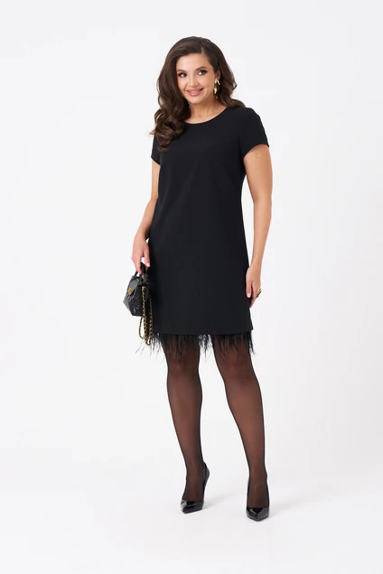 Это женское платье из поливискозной ткани, предназначенное для повседневной носки. Перед имеет две нагрудные вытачки, что придает изделию аккуратный и стройнящий силуэт. Спинка выполнена со средним швом и оснащена потайной застёжкой-молнией в шве для удобства надевания. Нижняя часть платья украшена декоративными перьями, добавляющими оригинальности и изящества образу. Перья крепятся на тесьму с кнопками, что позволяет отстёгивать их перед стиркой либо носить платье без них. Горловина, расширенная создает комфортное облегание и стильный вид. Короткие втачные рукава с фигурным низом делают платье практичным и легким в носке. Цвет изделия — классический черный, что делает его универсальным и подходящим для различных случаев.